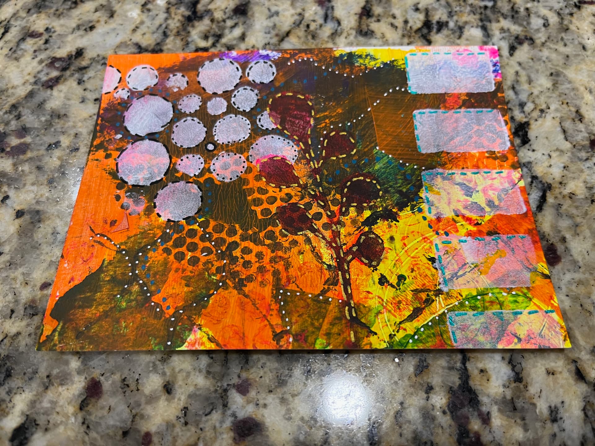 I love the artwork! The orange piece is absolutely fabulous…so much texture and layering as well as the colorscheme…