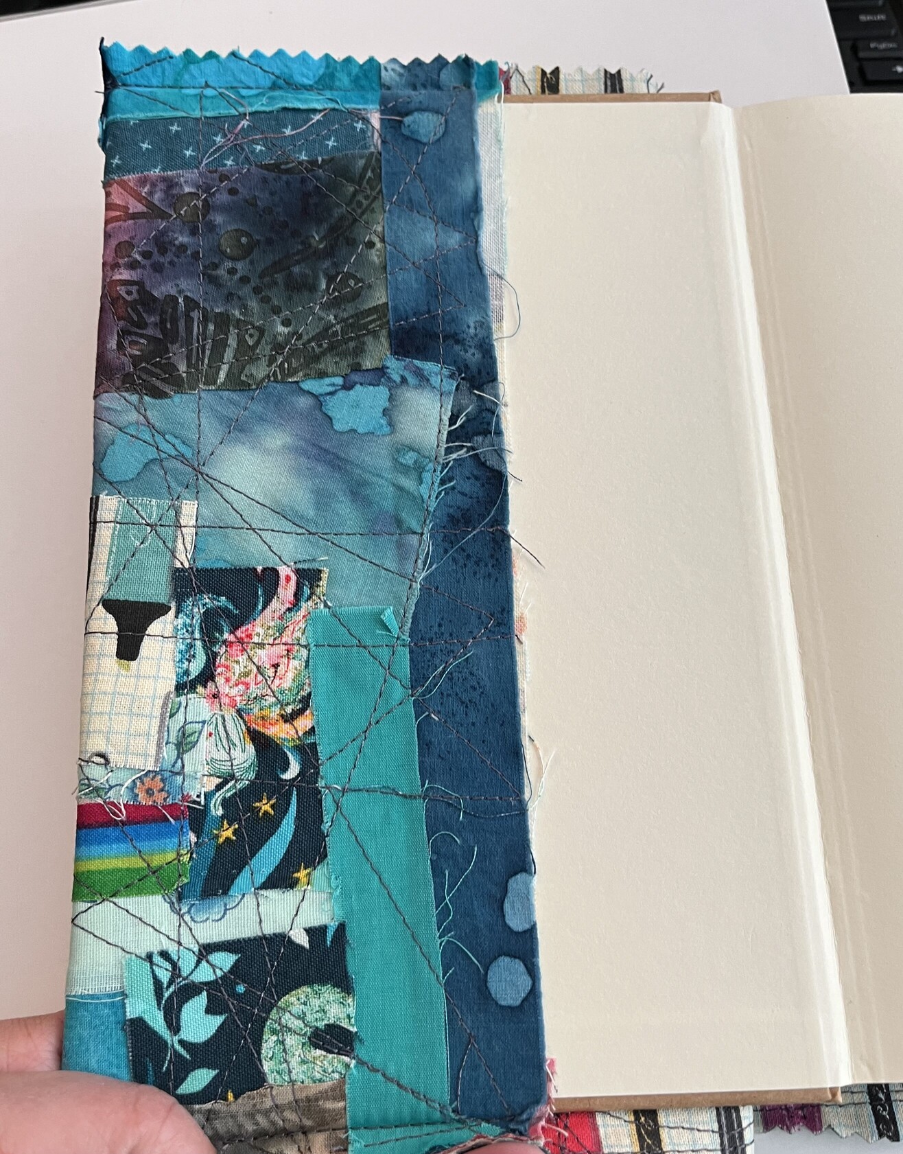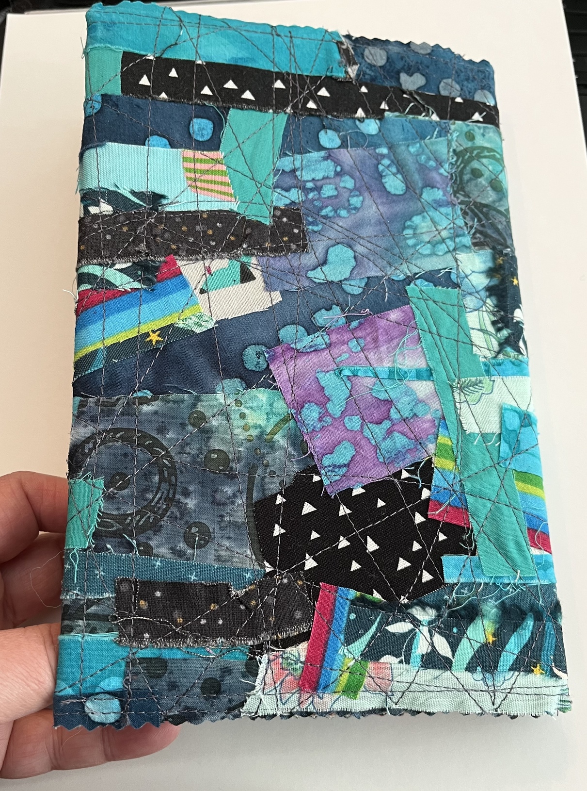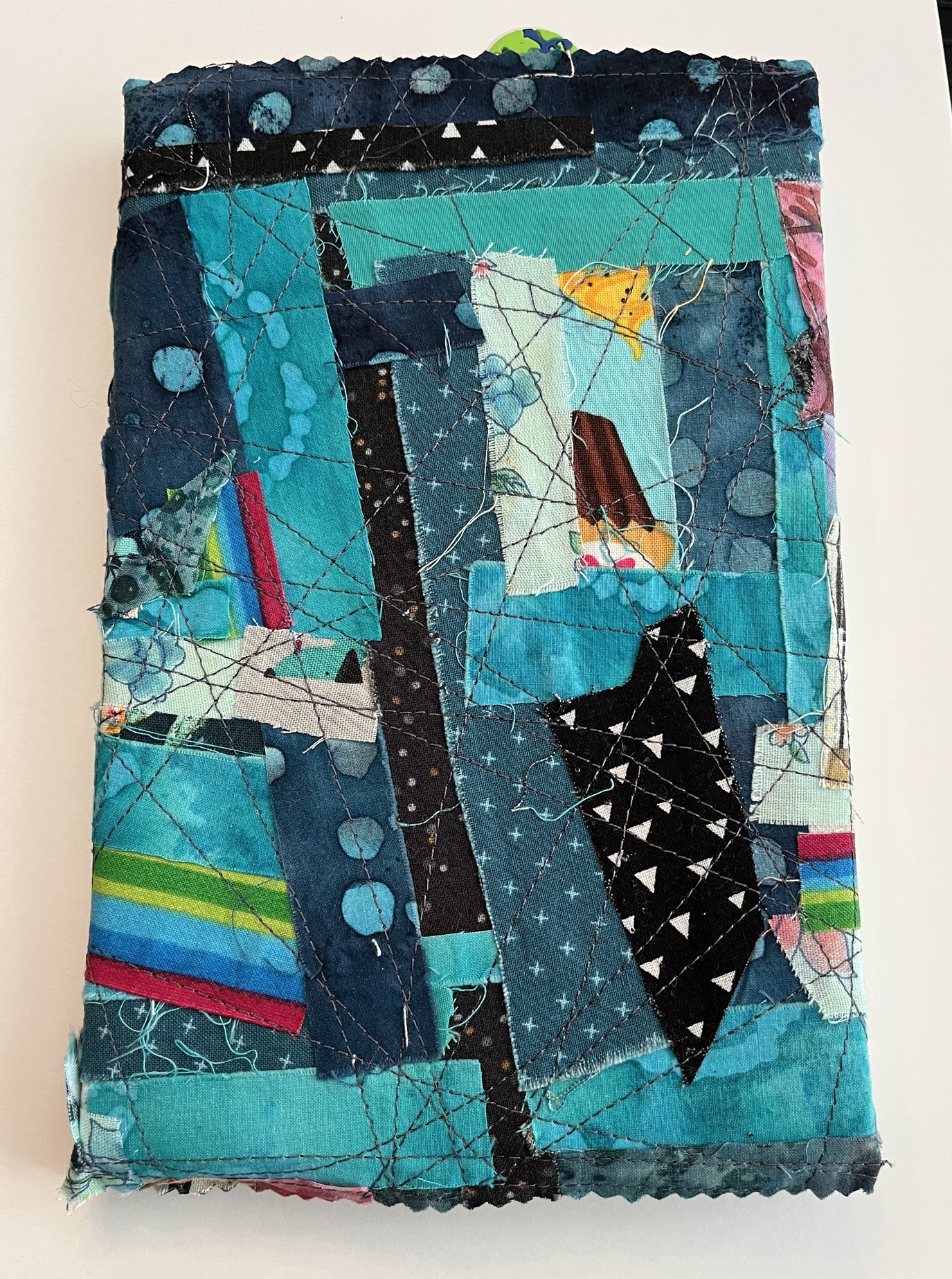 I received an awesomely scrappy book cover from @Kwality570 in lovely shades of blues and teals.