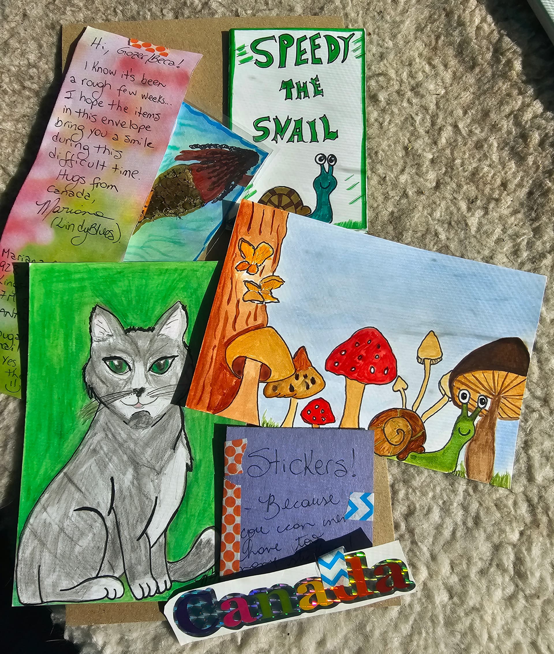 I got an amazing envelope stuffed full of awesome goodies from @LindyBlues. We agreed to send an envelope amount equal to one stamp.