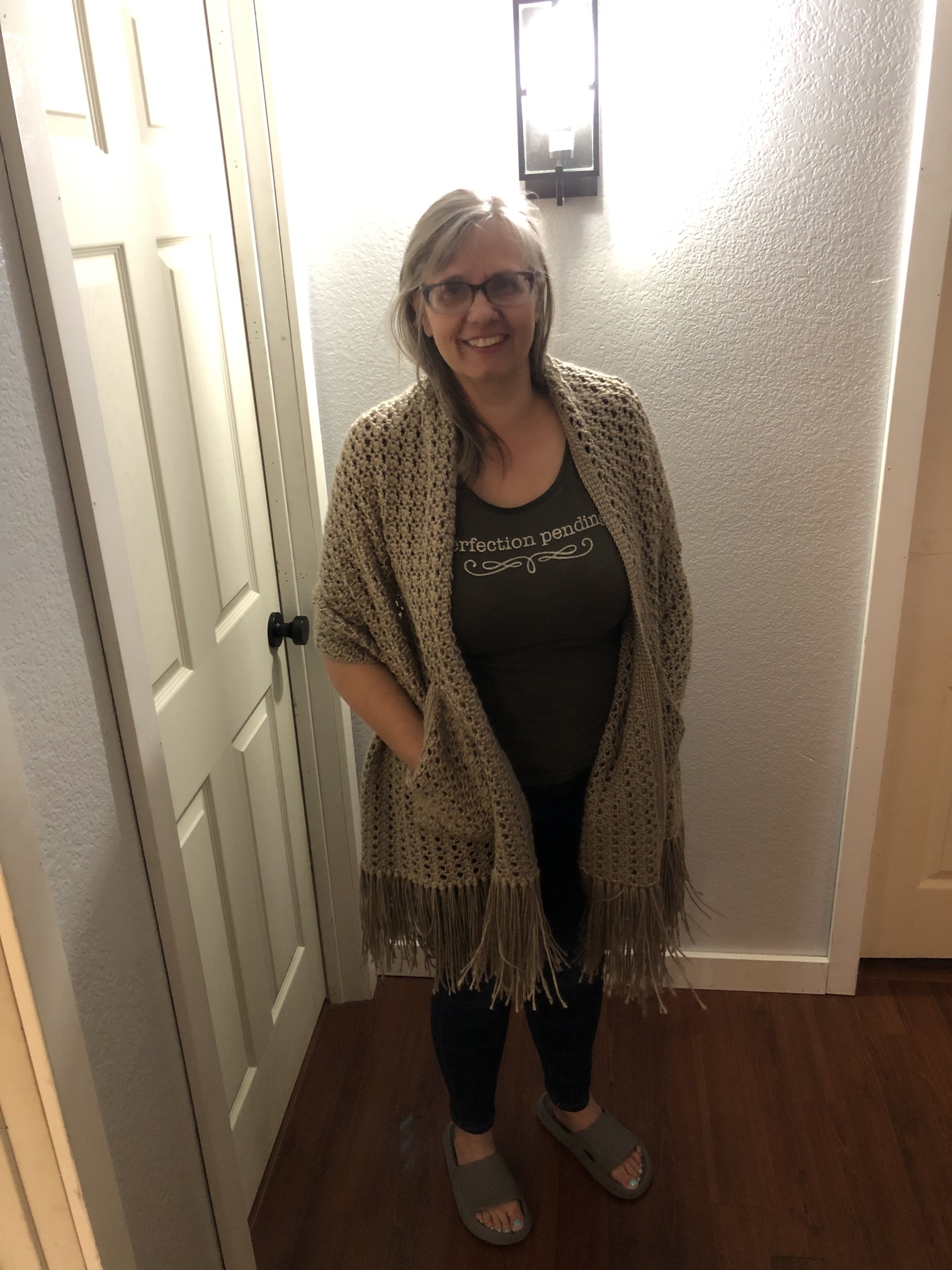 You look fabulous! We are the same height so I was hoping the length would be good (I did not buy any extra yarn and but I really wanted to do a funky fringe for you!