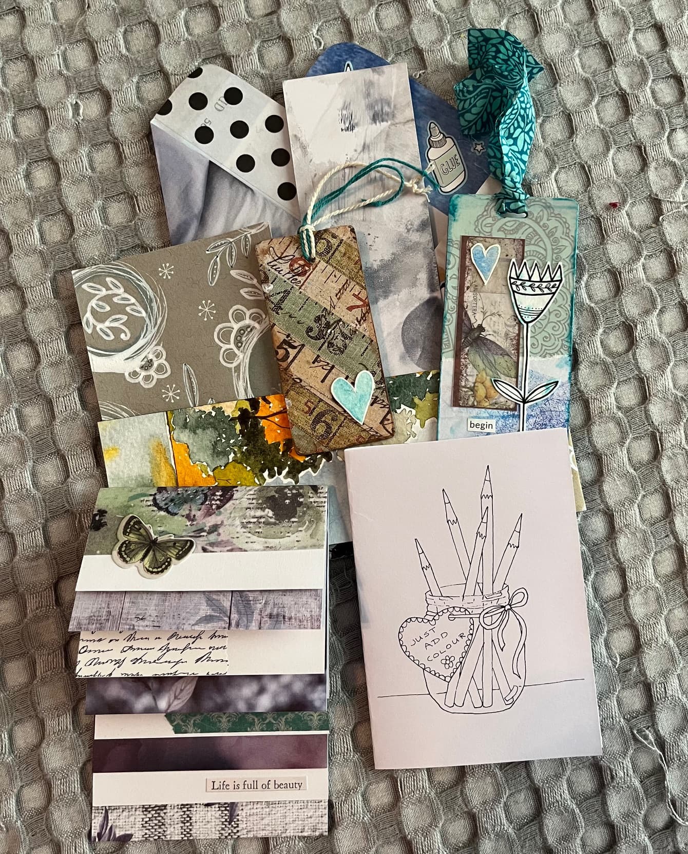 a coloring zine! a waterfall paper stack - that turned out lovely! tags and random bits