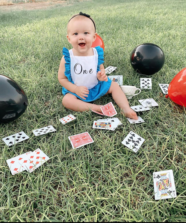 My granddaughter turned one! Her party is today and it’s Wonderland themed. My daughter wanted a special outfit for the baby to wear and begged me to sew something. I’m starting with an action shot coz this kid is beyond adorable. (says the doting grandmother)