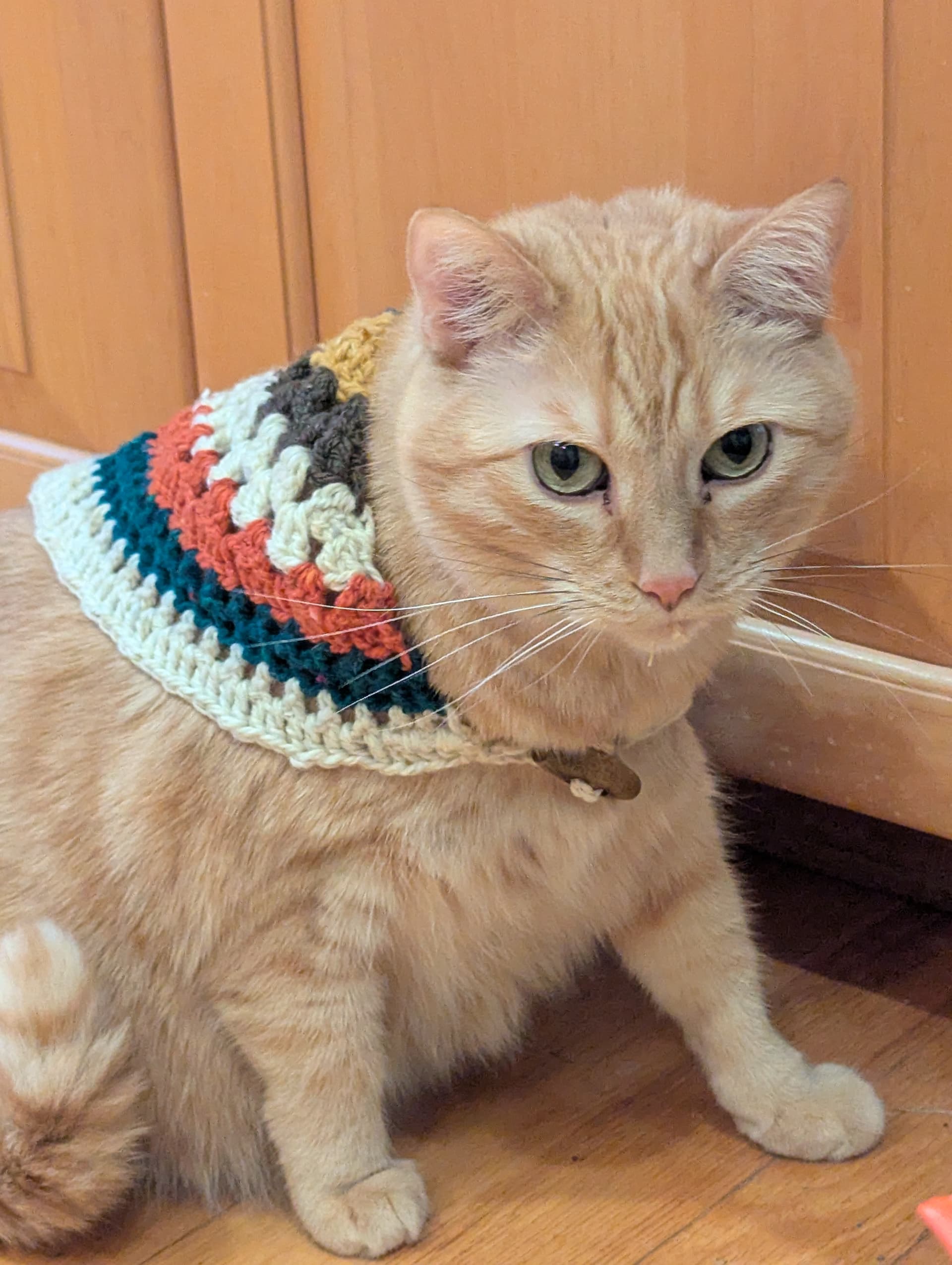 This is absolutely ADORABLE. OMGGGGG SO CUTE! The shawl is really nice looking and definitely suits her. I hope she likes wearing it! I wish I could have a little kitty.