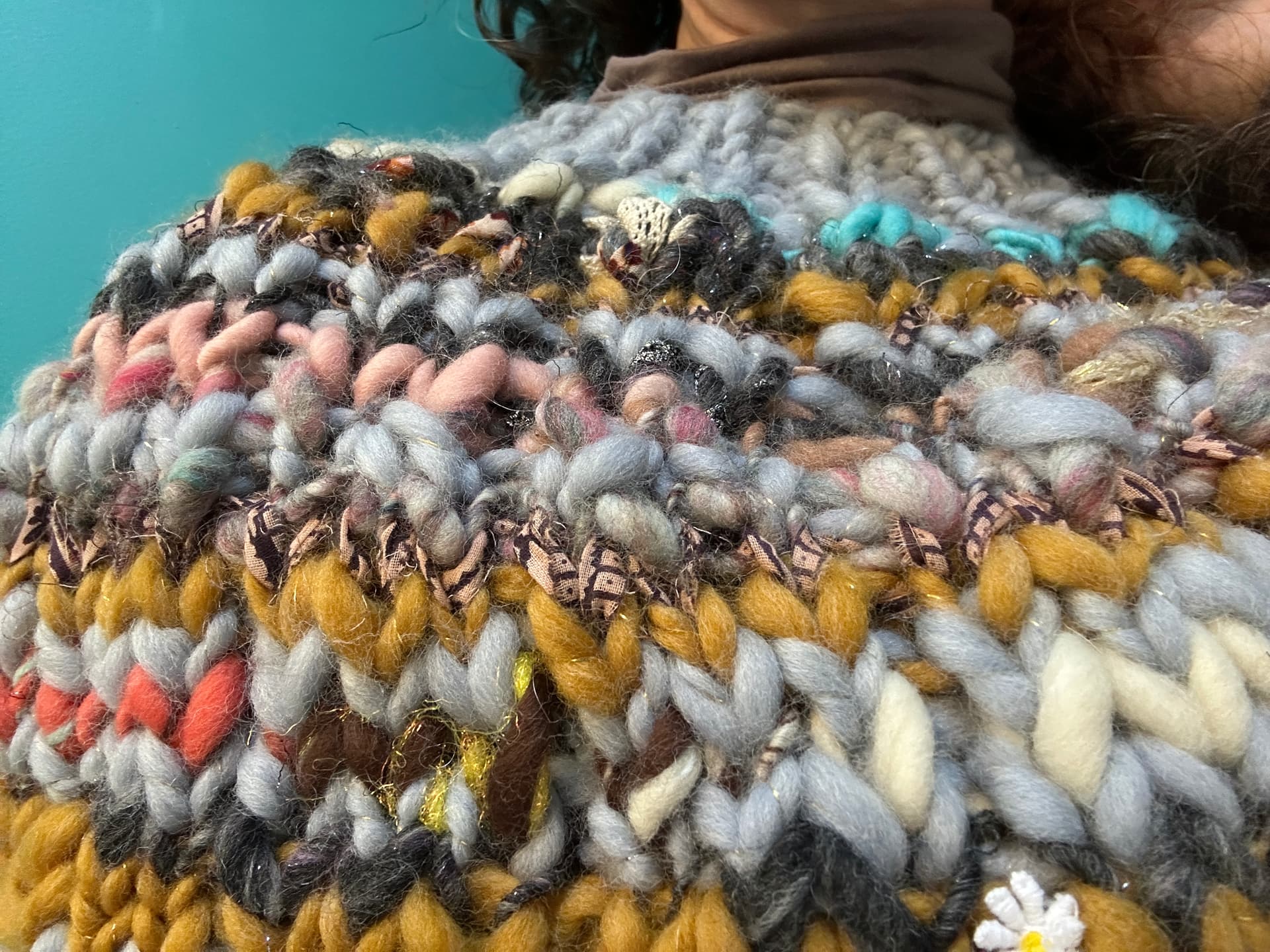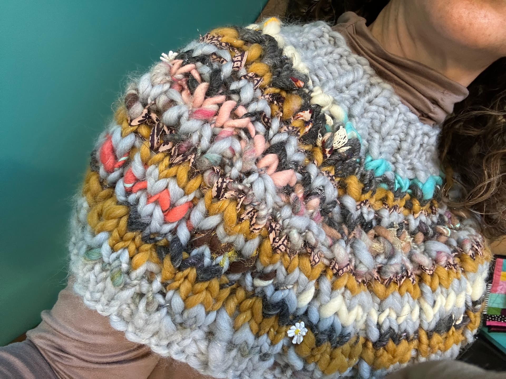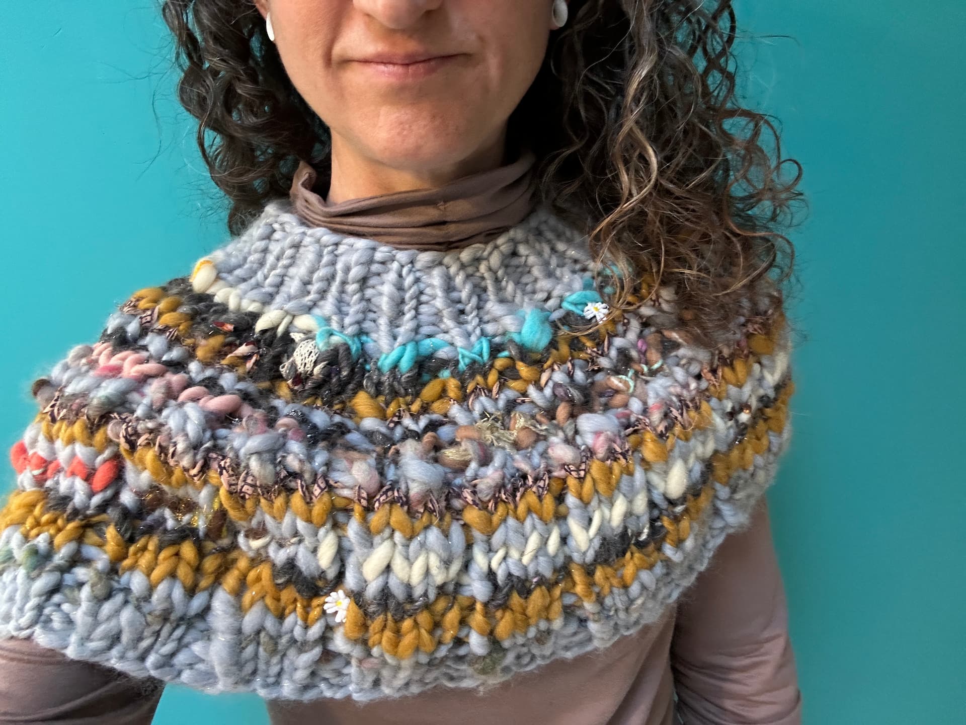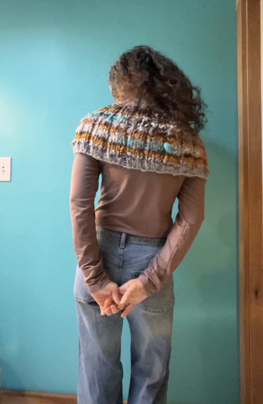 I LOVE all the textures and colors, it looks so great on you. It seems very in style with all the dickies, and cowl hoods in popularity. It seems like great to throw on under a coat to reduce the bulk of a full sweater while still giving you warmth, or something to wear around the house. Also, very cute on zoom calls where chest-up is all people see anyway.