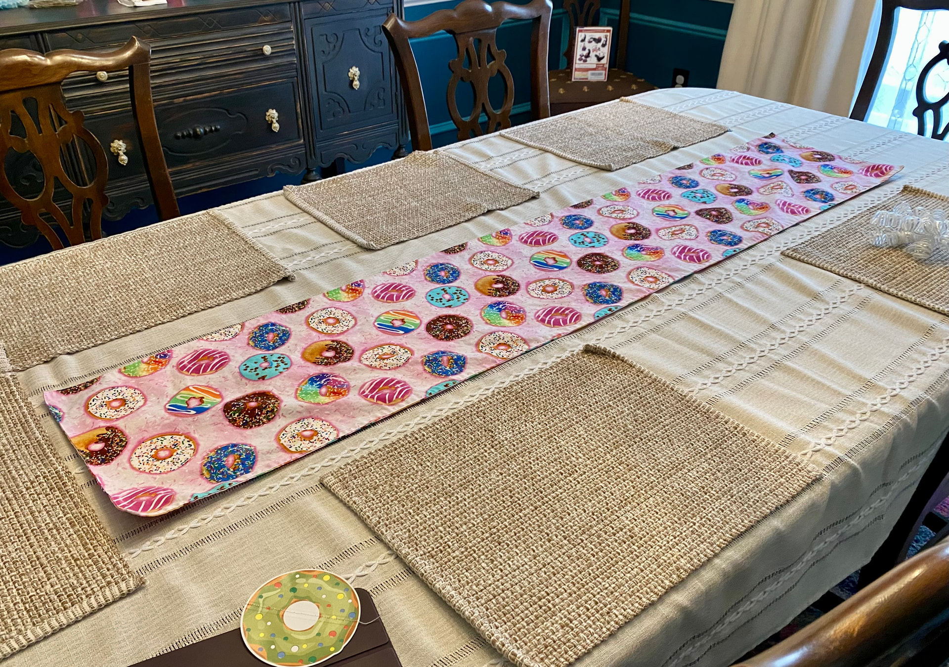 For my daughter’s recent Donut Birthday, I had planned to order her an embroidered tee shirt to wear, and to make a simple table runner out of some donut fabric I found on eBay. The adorable fabric was from Timeless Treasures, but it must be way out of print, since it was the only listing for it on either Etsy or eBay. The listing was for 2 yards, but they later messaged to say there was only 1.5 yards, and since that was enough for a table runner, I took it. (They kindly gave me a partial refund AND sent me 1/2 yard of a fun print with sprinkles on it.)