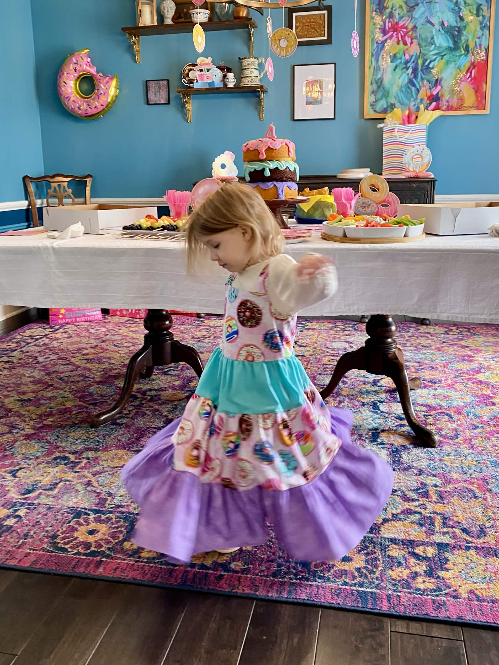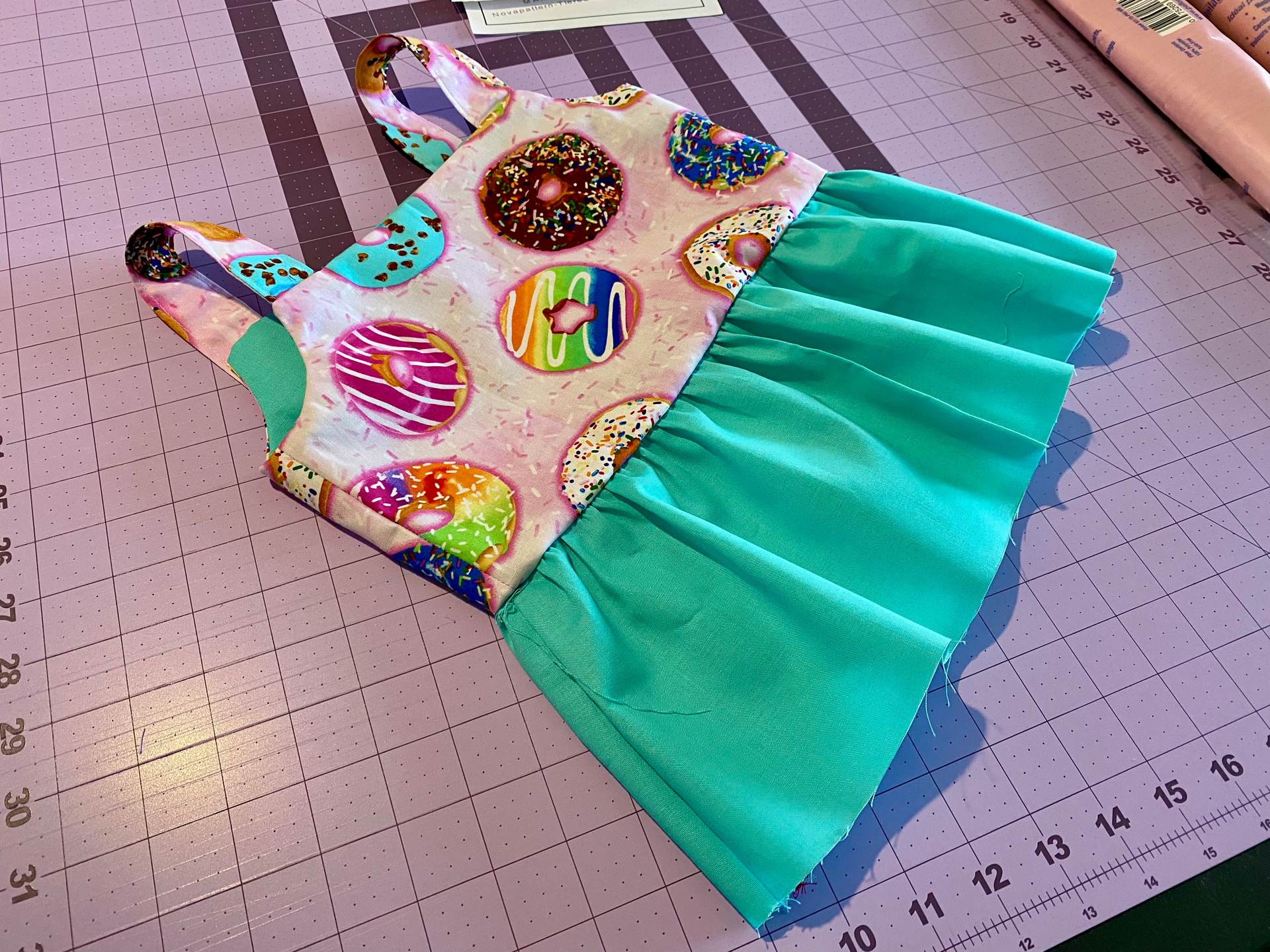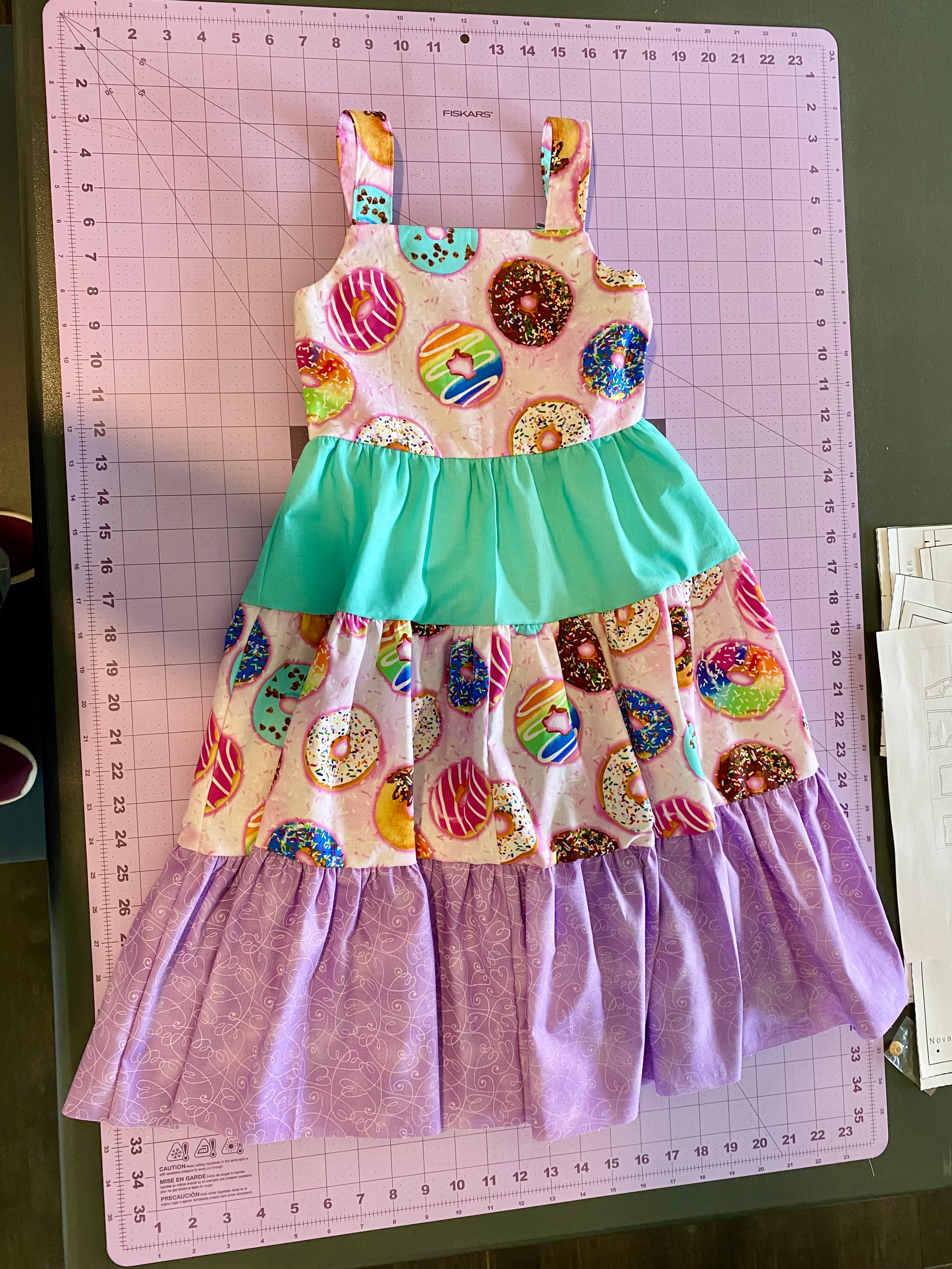 Since I had already made the runner, I had a piece of fabric 1.5 yards long, by 17" wide. Not enough to cut a dress, even for an incredibly skinny 4 year old. I searched Etsy for a digital dress pattern that might work. I found this cute dress pattern, and realized that I could cut part of the dress from the donut print, and use other fabrics for the remaining tiers, to make up the difference. (After working on it, I think the image for the dress is AI generated, because the tiers are a long longer than it looks like.)