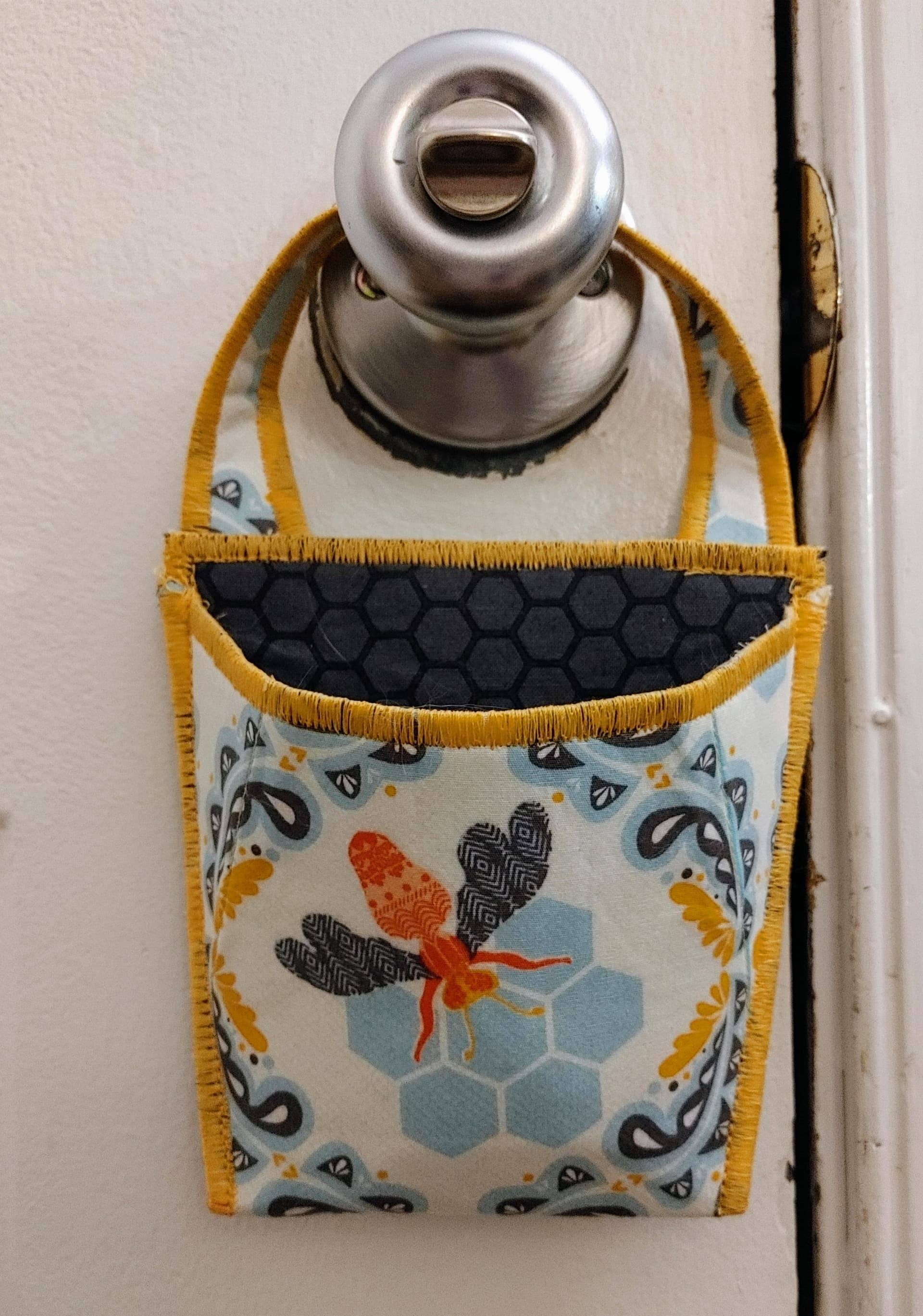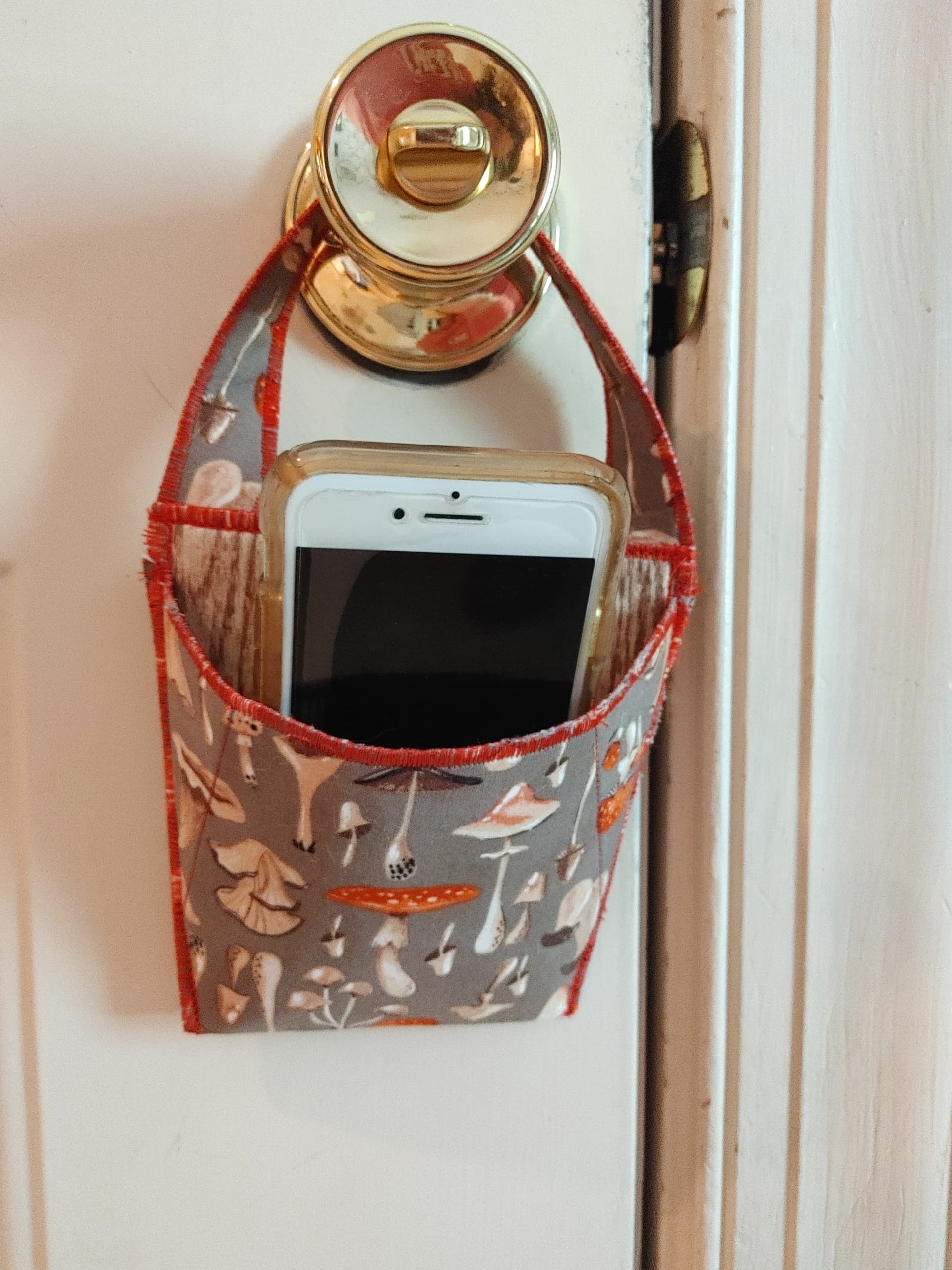 They are kind of small but just big enough. You could put your keys, cell phone, sunglasses, work badge, or other items you always seem to forget. They hang right on the door handle as a great reminder! The pattern is Lazy Girl Designs - Hang On.