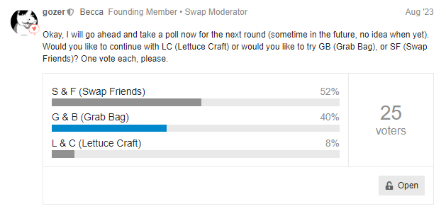 Per the last round, we had a vote, and the participants wanted a new set of letters to craft. The winners were S and F for Swap Friends.