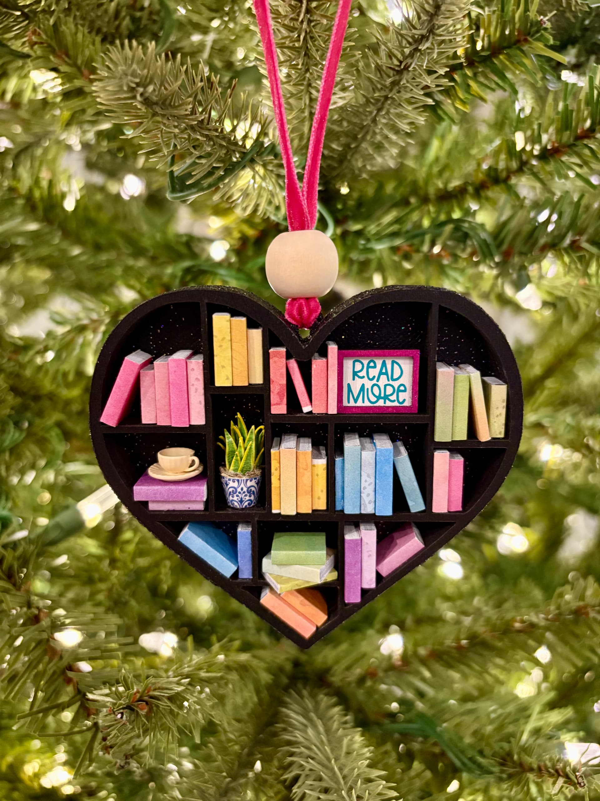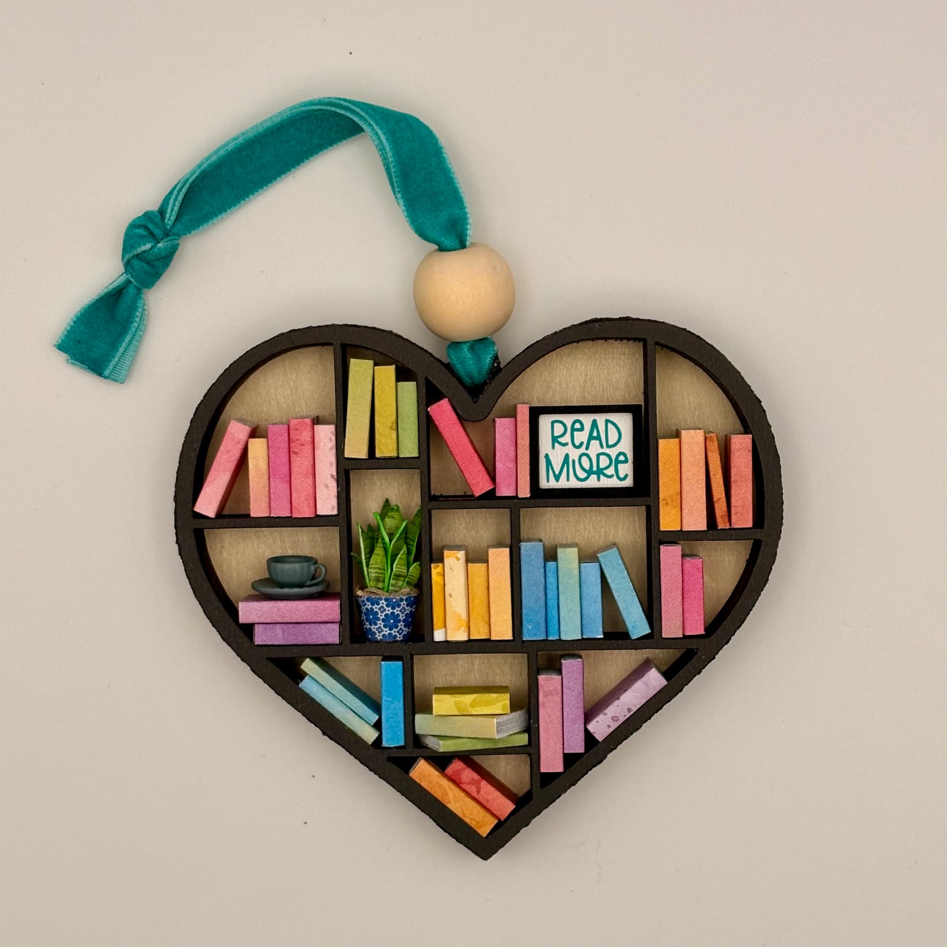 - For the Love of Reading Mini Bookshelf Ornaments (heart shaped by Audiobooklover)