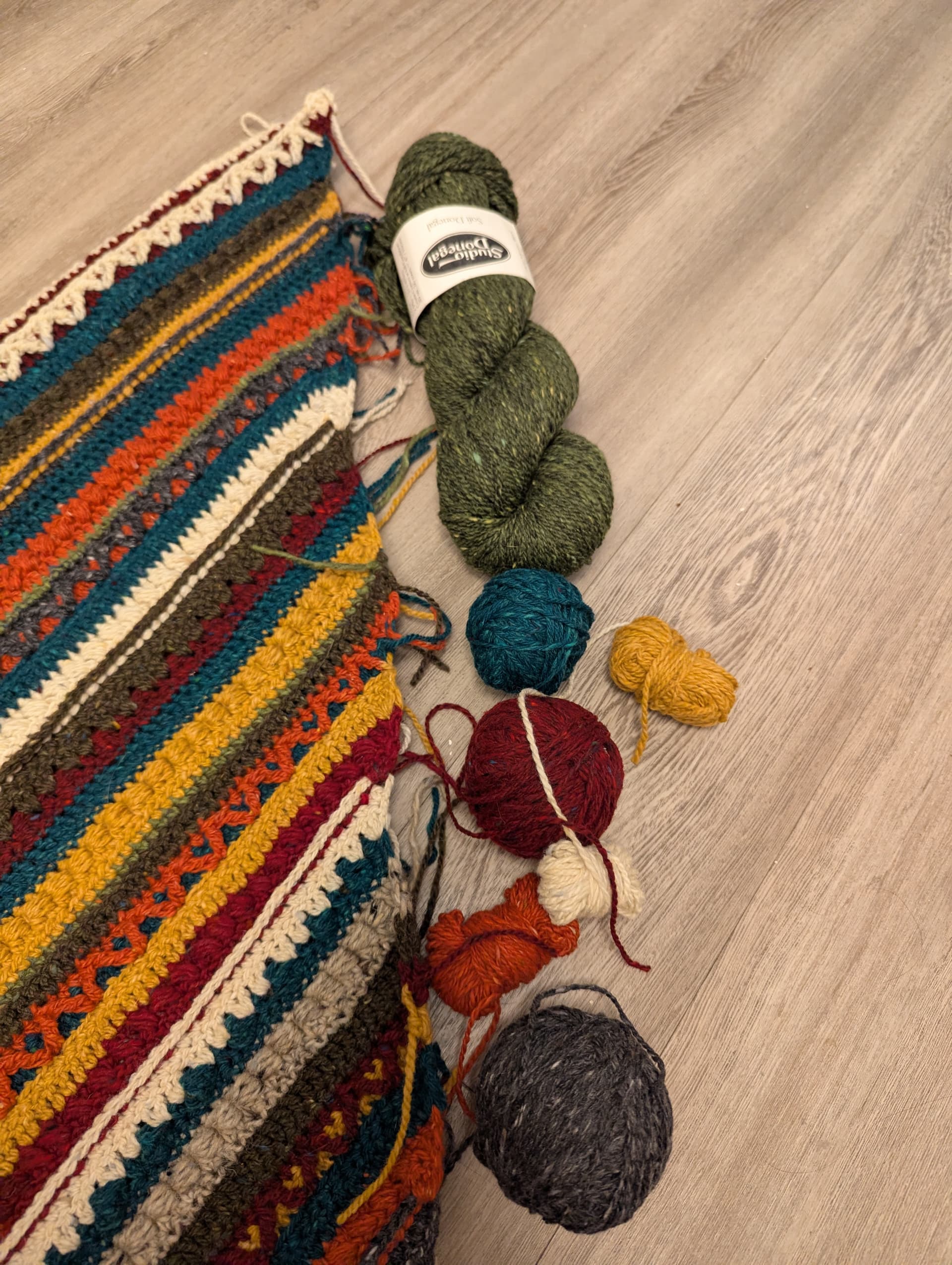 A great thing about crochet is the ease of experimenting. If it were me, I would probably start by using that green I have the most of and square off my wonky edge and then take that yarn once thinly around the whole to frame the triangle to see how it looks, especially as you mention that you don’t have it represented elsewhere in the shawl so that might be important to you. I don’t have a good pic anymore, but I had to do that with my Mutts blanket seen here on LC and if you zoom in you can tell the black side borders wobble a bit but even at high contrast it isn’t screaming, “she can’t count!”