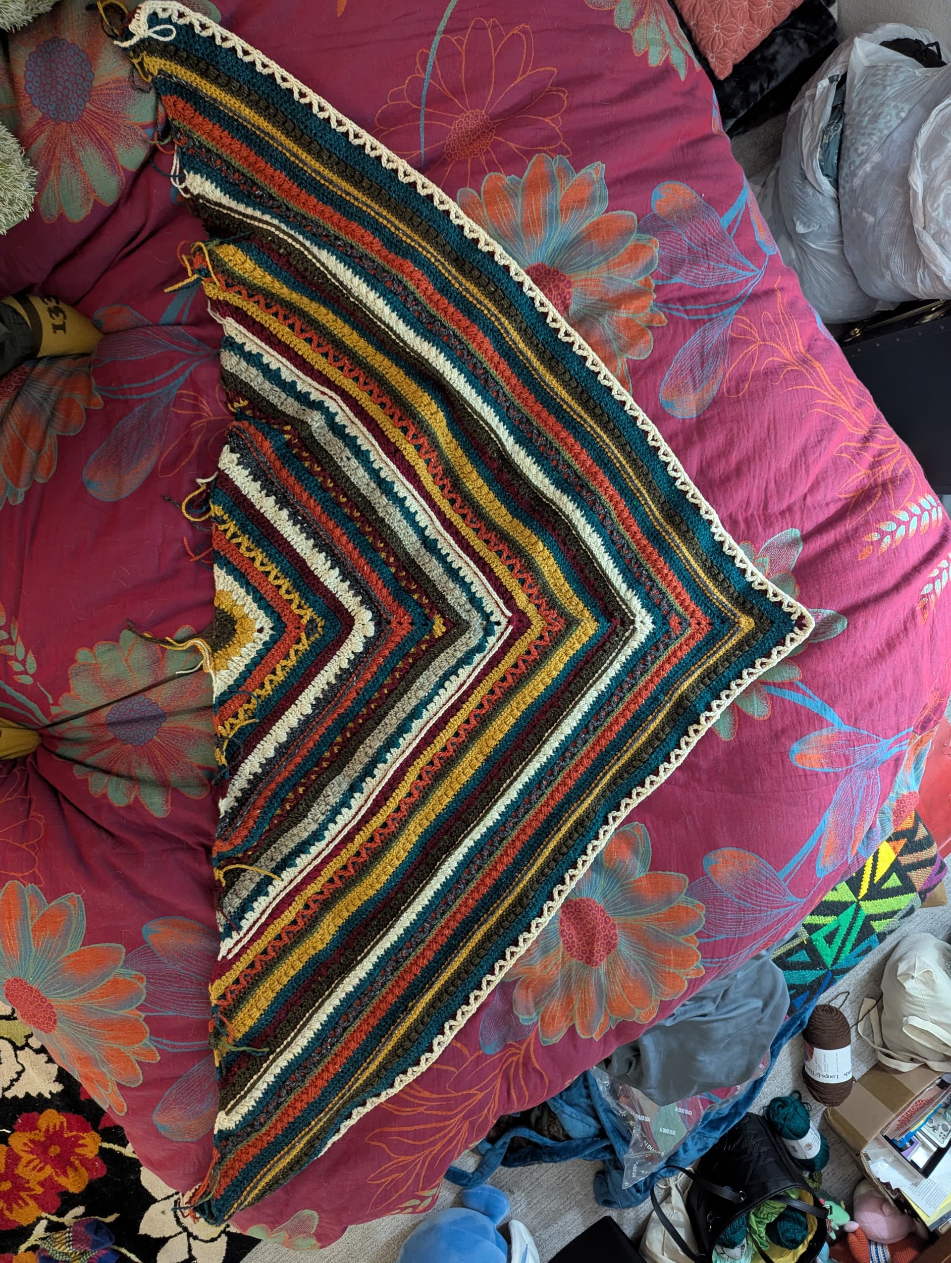 Thanks! Basically, I’m almost finished with a shawl I’ve been making for myself with yarn I got on my Ireland trip last year, and I’m running out of it. But I’d like to make a border just along the long side, for two reasons. Here’s what I’ve got so far (I started with a pattern but modified it a lot in many ways that could definitely be seen as mistakes, so I’m not sure it’s fair to link it here lol):