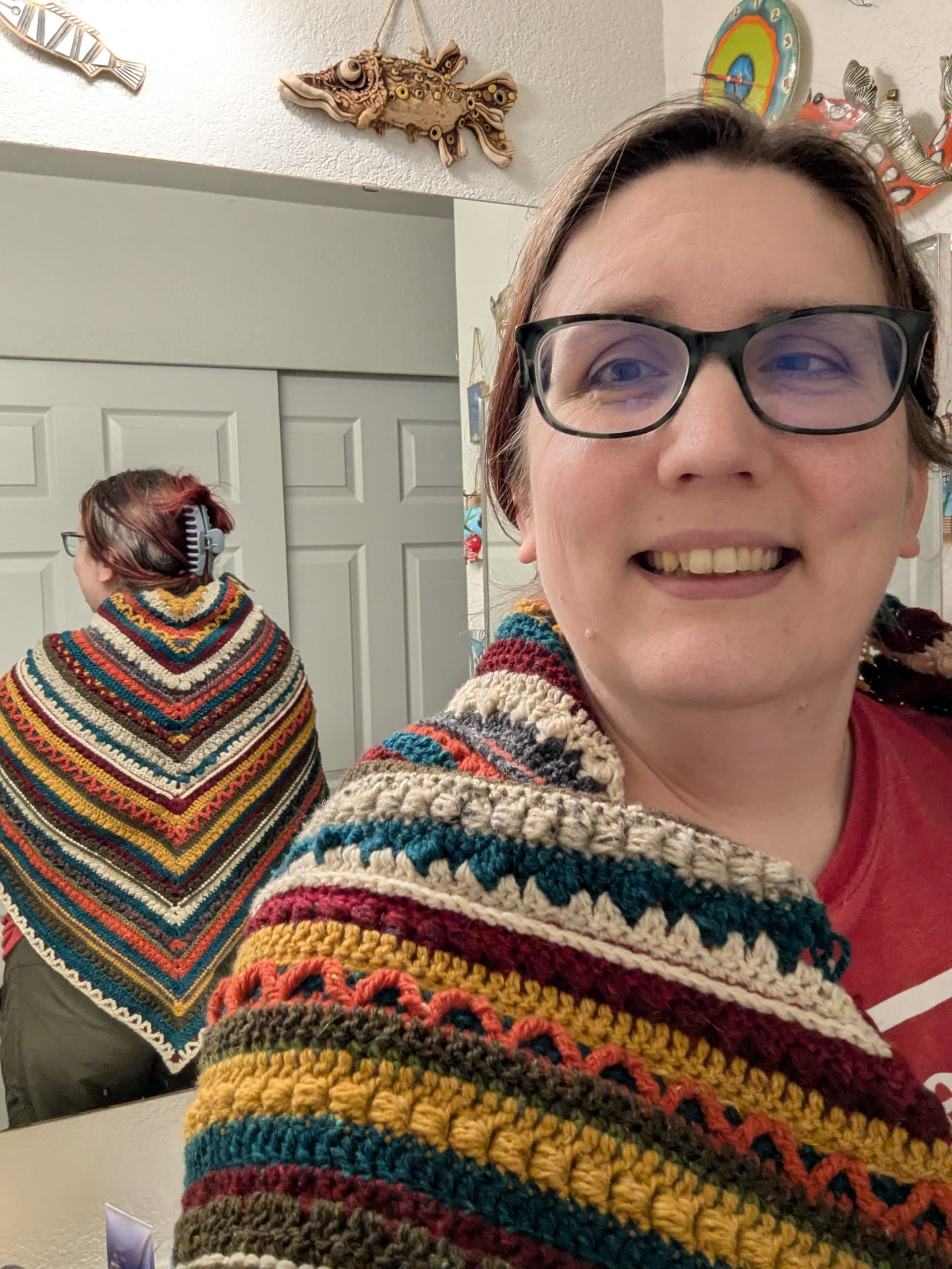 Then, if I’m honest, I would take pics and overthink it for hours (at minimum) and frog it back to see what the red would look like. That probably doesn’t have enough to go around so it would be a collar-edge only experiment. The red would be more eye-catching, but also looks great with your coloring, and ties in with the four (I think) bands of it within the body of the shawl.