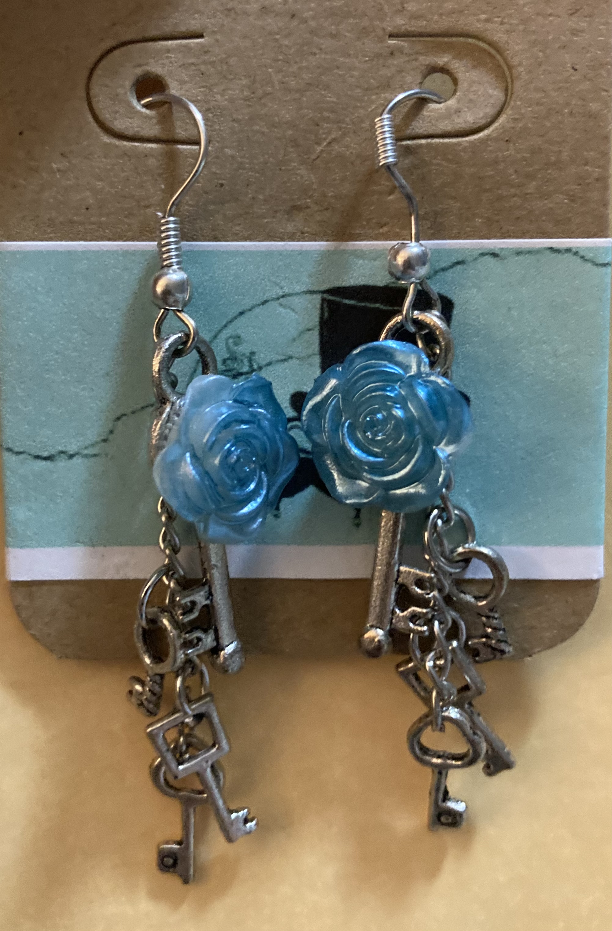 In addition to the amaze balls painting (I seriously can’t stop looking at it!), she sent along some of her gorgeous jewelry… four pairs of earrings, a necklace, and also a pretty set of notecards. The blue roses with the keys are my favorite