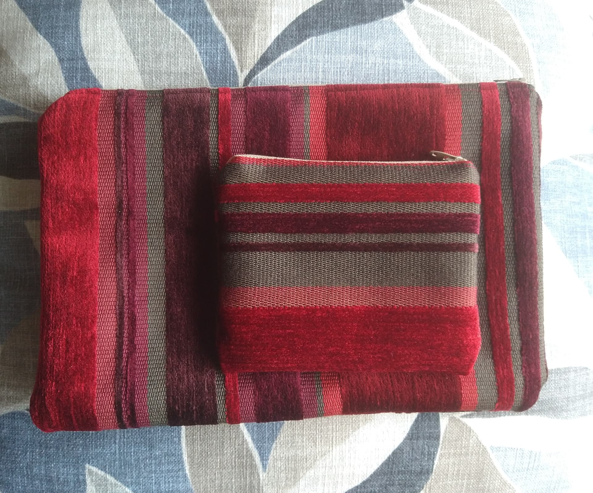 @Bunny1kenobi and I did a personal swap and she sent me these fabulous zipper bags for notions and small projects. The outer fabric is very heavy-duty and the red stripes are velvet.