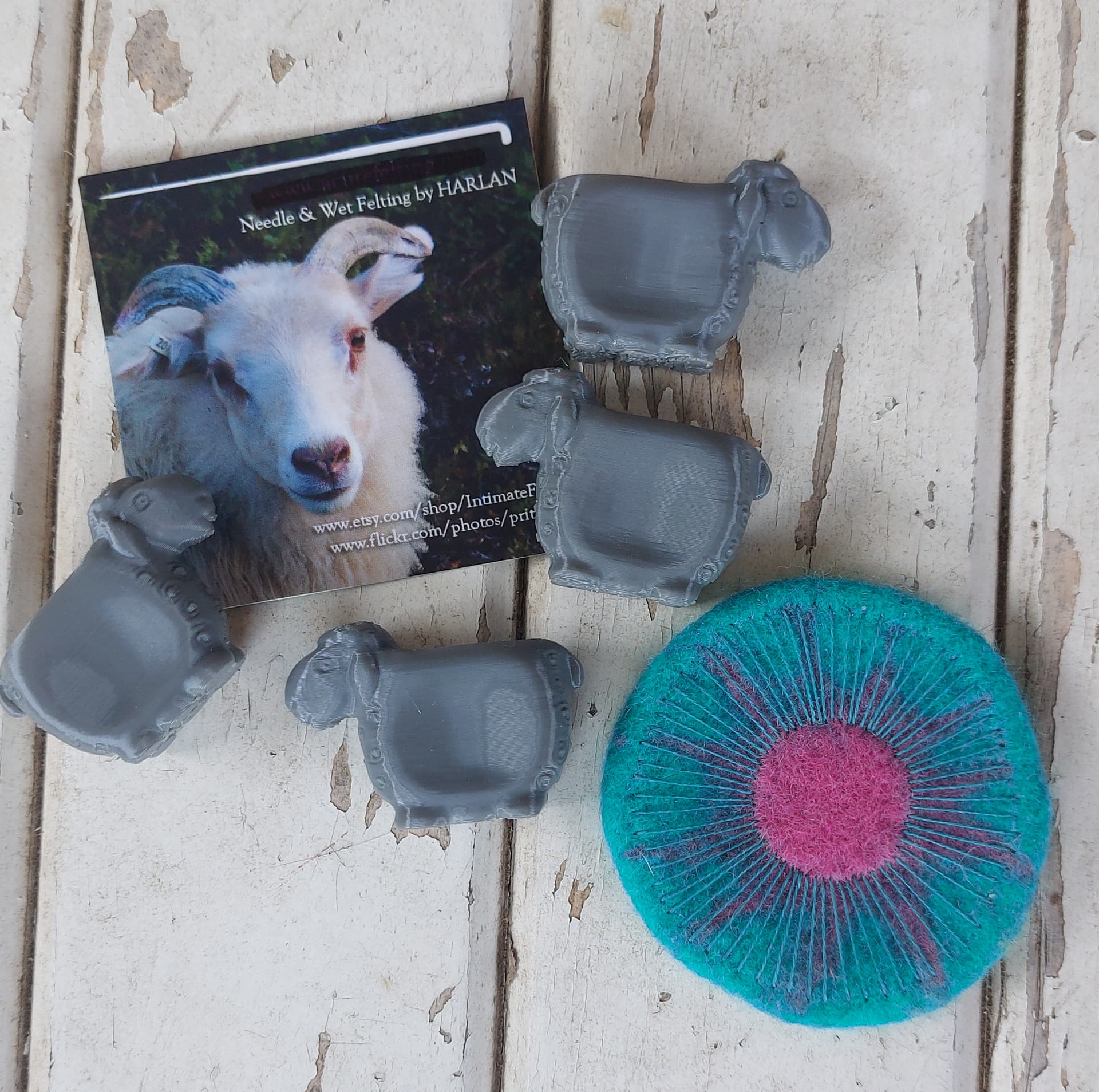 @Harlan was super sweet and sent me some of her awesome needle felting tools. They look like adorable little sheep and I can’t wait to try them out. She also sent a cool felted round. I love the colors! I’m thinking of turning it into a magnet or a pin.
