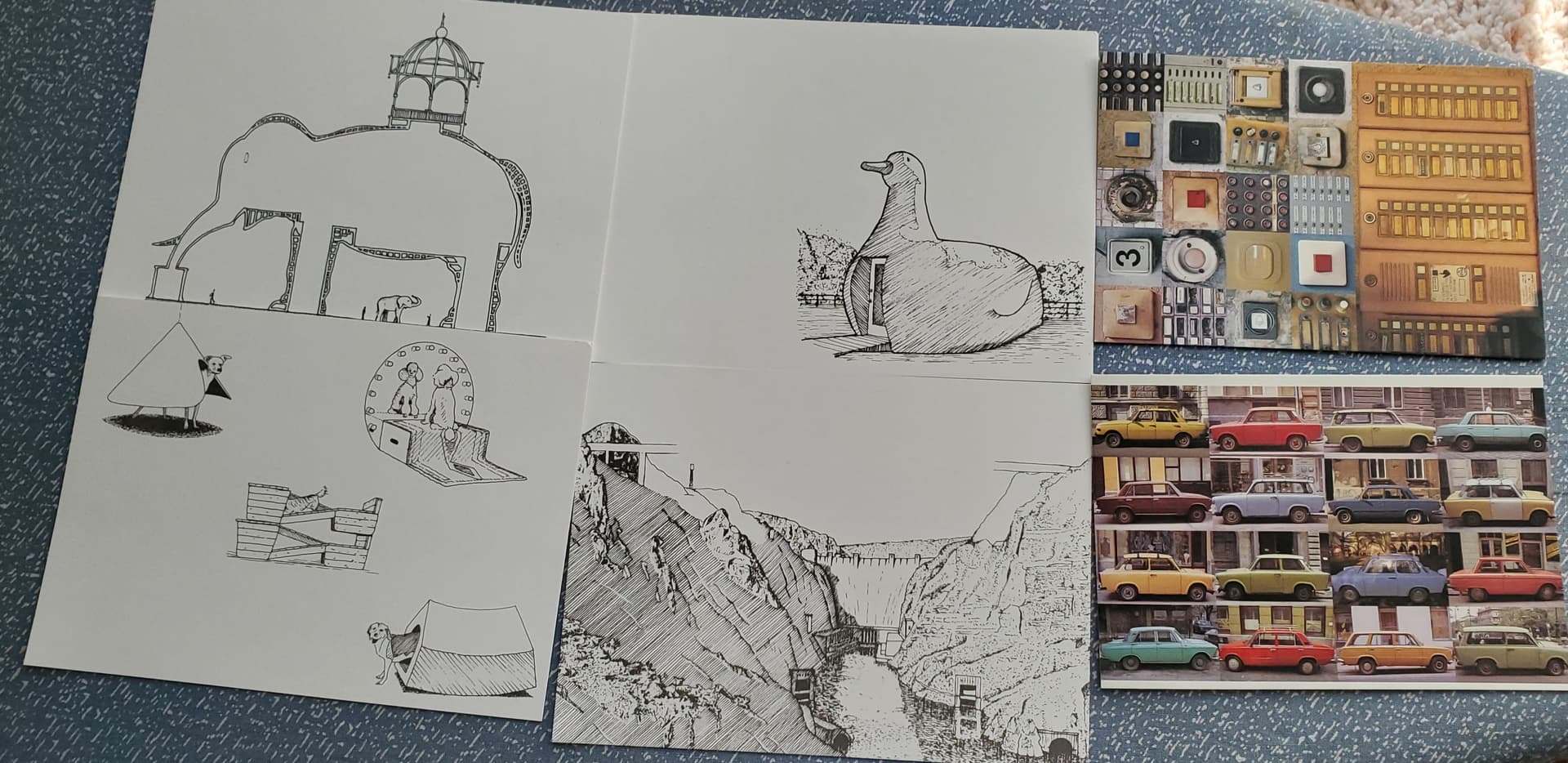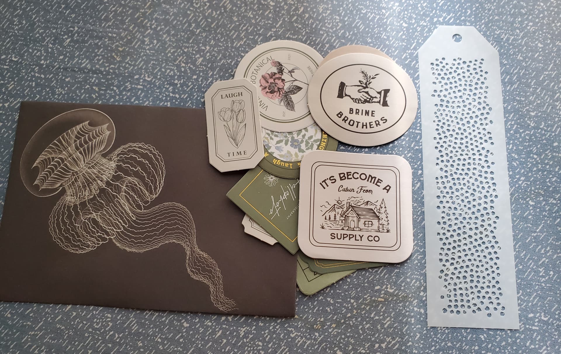 Labels (that I suspect are stickers), a stencil, and a bunch of cool postcards