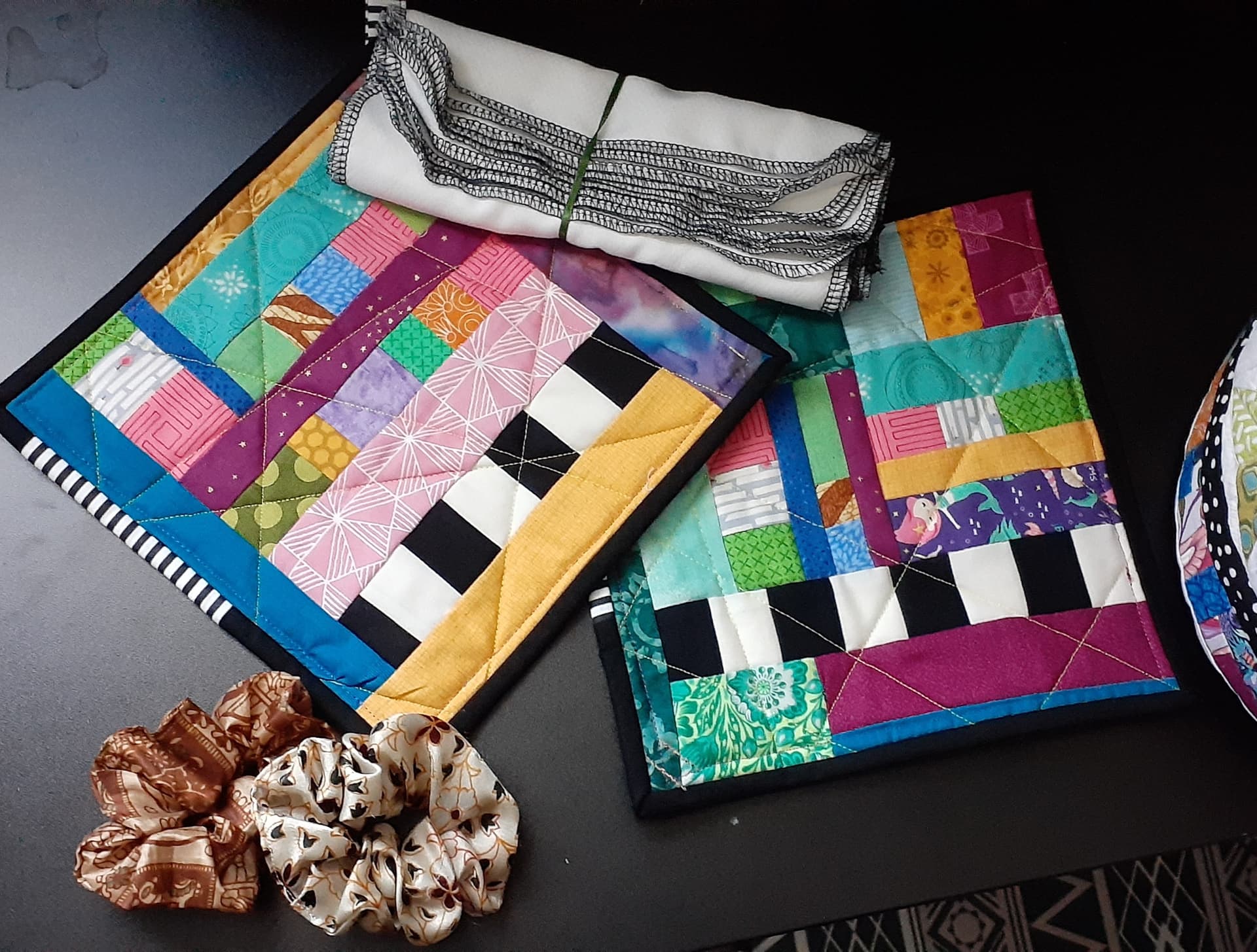 Jennie, being Jennie, can’t be stopped and made all these beautiful extras: 2 scrappy potholders (I’ll probably use as mug rugs), unpaper towels, silk scrunchies. All so beautiful!