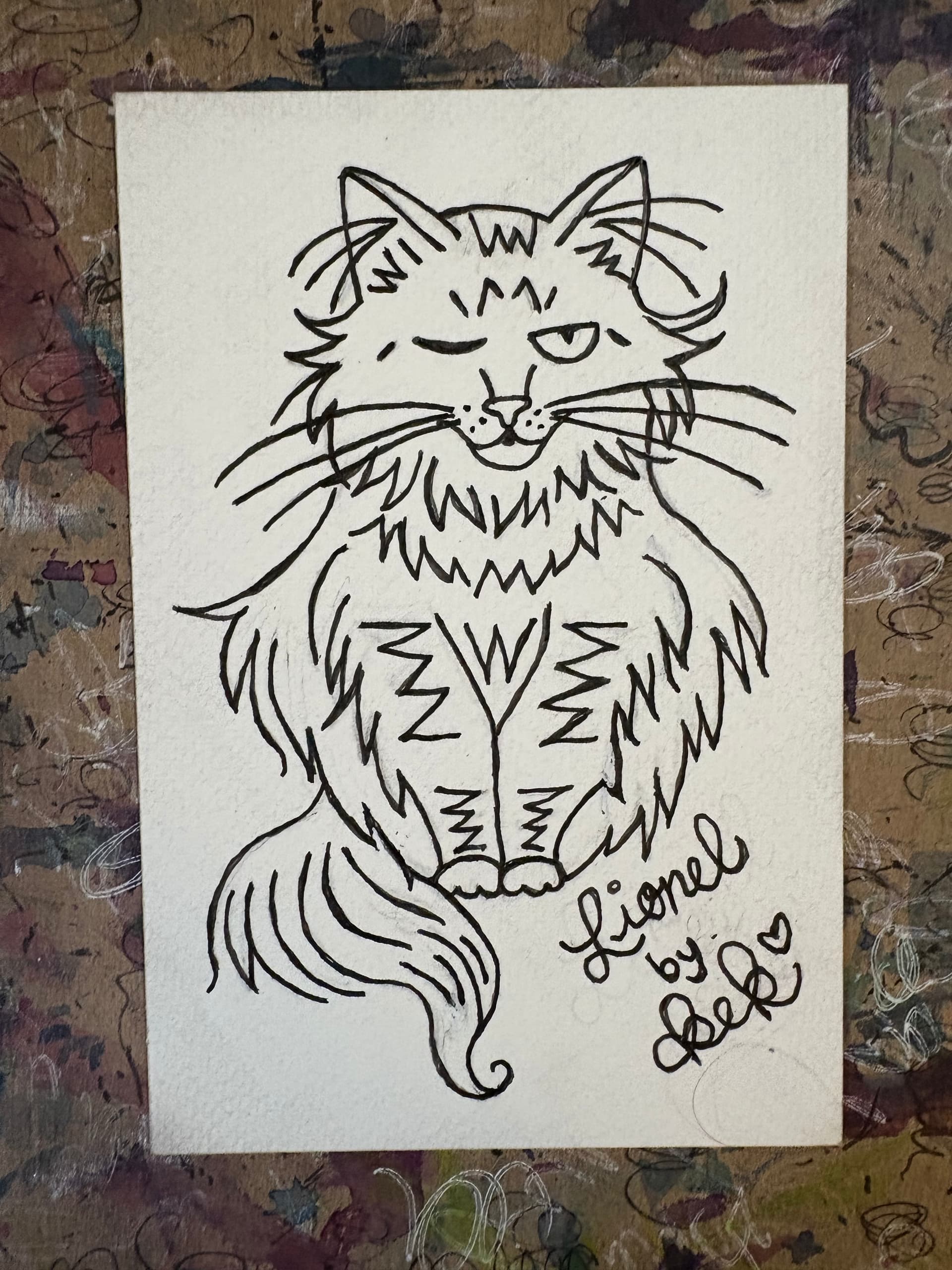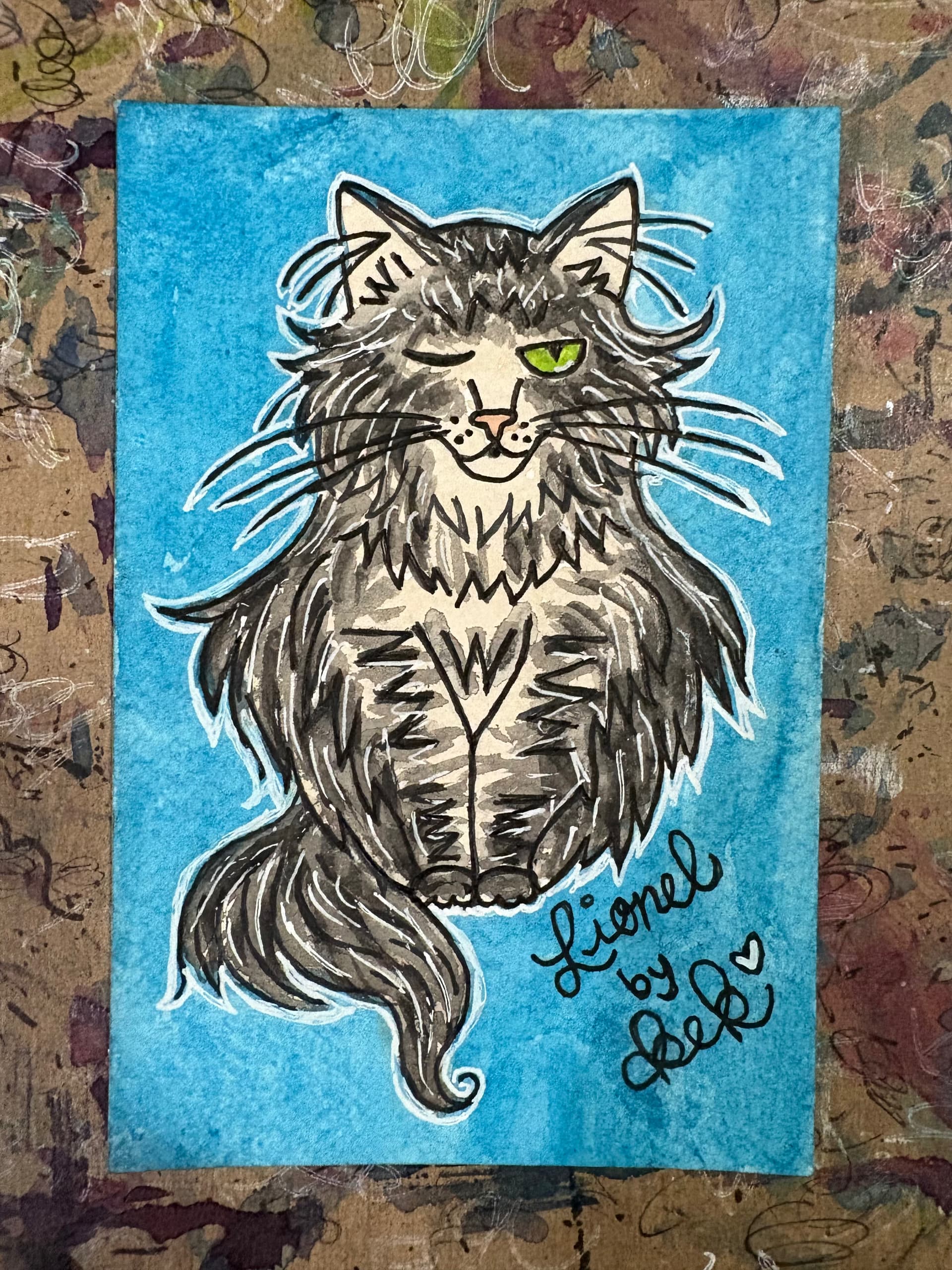 I’m a big fan of Andre Hyland, an actor, writer, director and artist. I love his cat, Lionel, so I thought I would draw him. I don’t do pet portraits at all, but I think I may start! 4x6 watercolor.