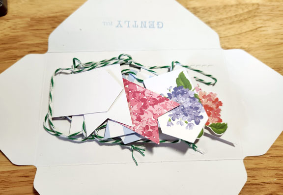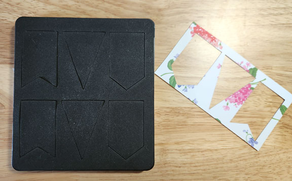 I wanted to include a little something in a store-bought birthday card. That card has pennant buntings on the front, so I decided to use this steel rule die to cut some!