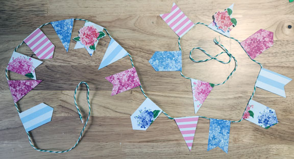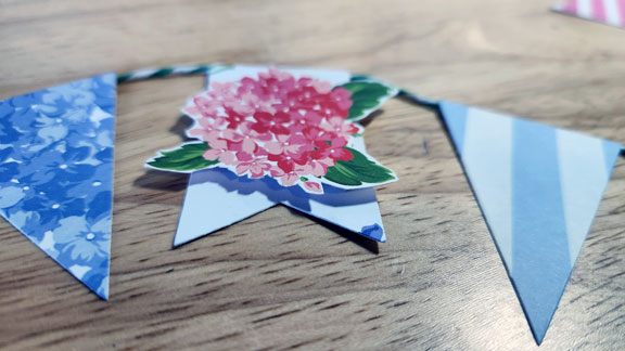 All the papers are from a pad of printed cardstock. One of her favorite flowers is hydrangea, so I went for it. The print with the white background was impossible to get a row of three that had the blooms on them. So I fussy cut a couple for those and attached with adhesive foam.