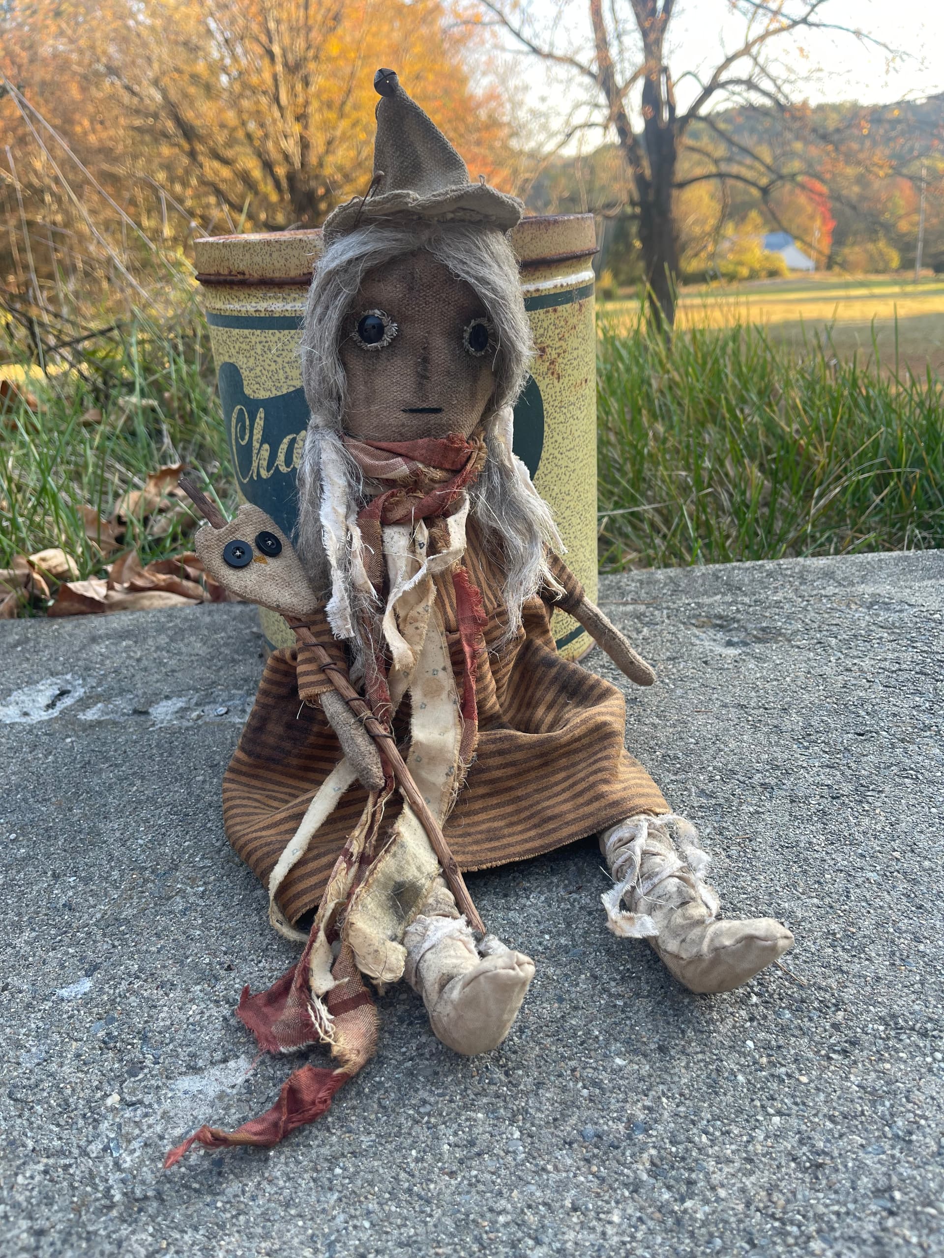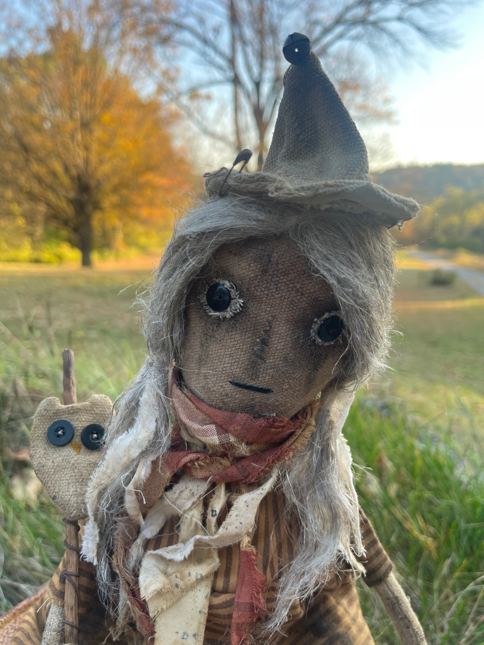 The little witch is primarily made from painter’s drop cloth and aged with instant coffee. Her hair is flax wefts that I needle felted onto her head. Her clothing is from my massive pile of scrap fabric. It was also all aged with instant coffee.