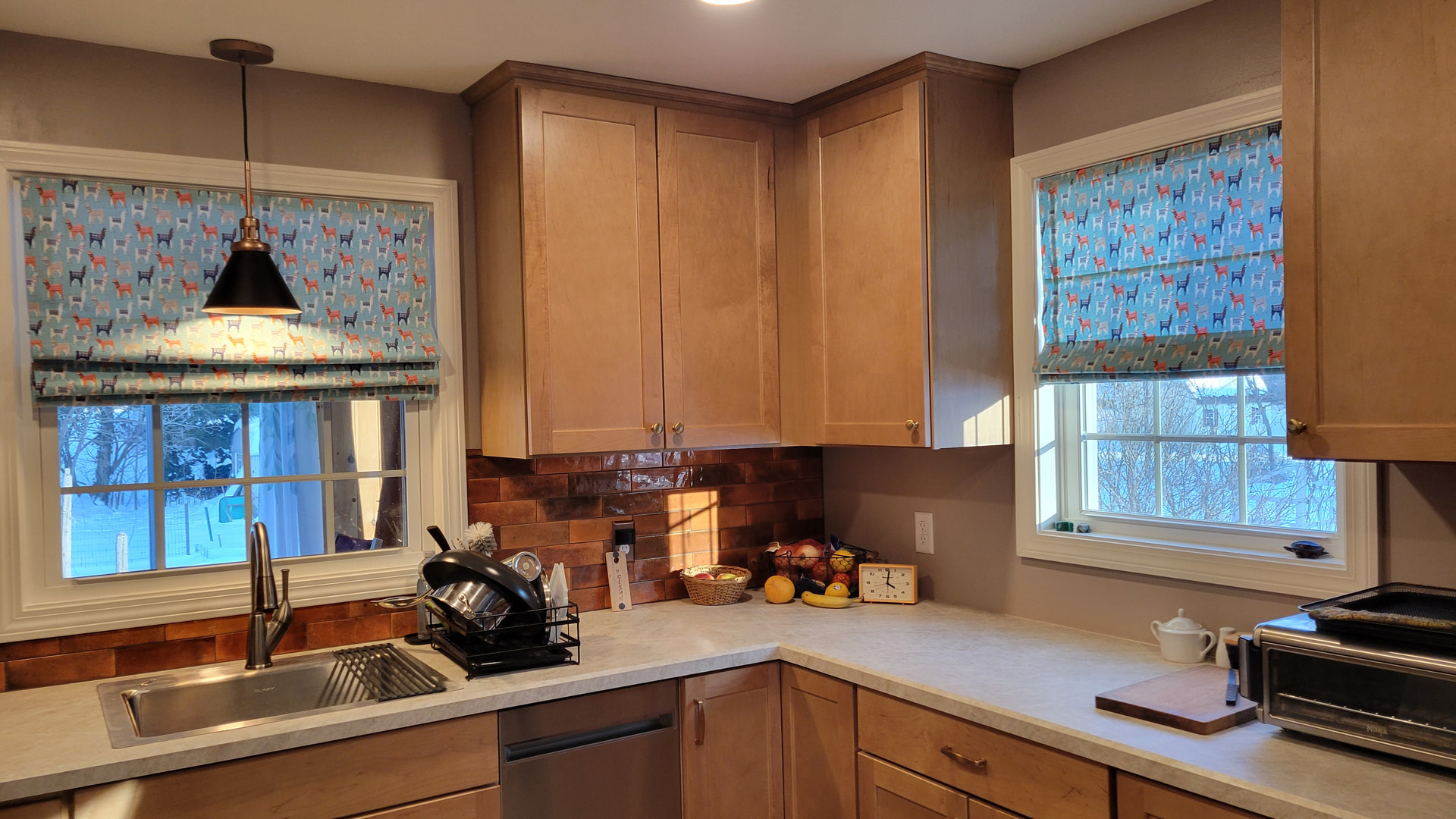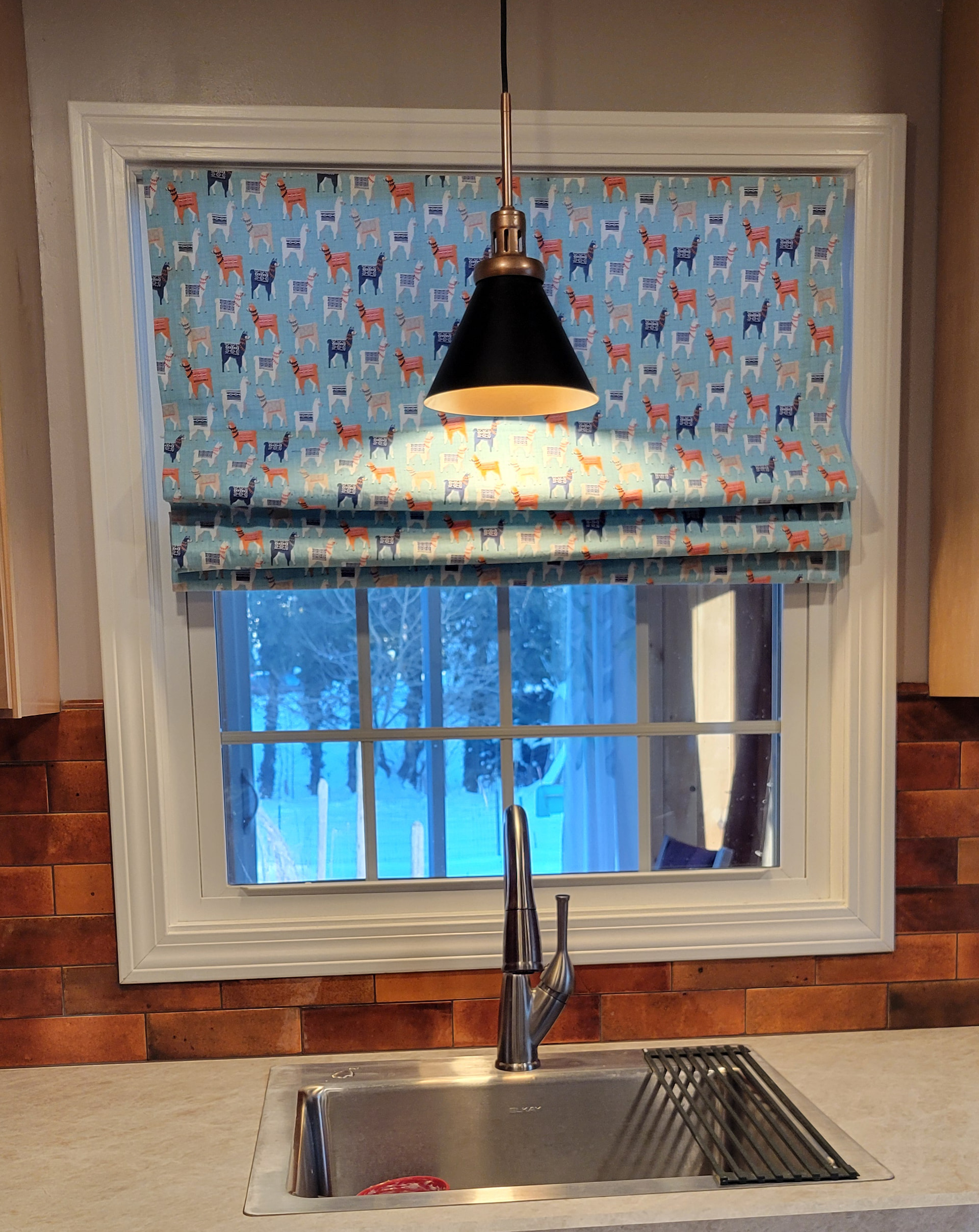 So little llamas now dance in my kitchen. I used cheap cordless miniblinds, stripped the slats, then added the fabric. It is more complicated than that, but YouTube has some good tutorials. I chose to use Velcro to attach because I wanted it to be removable and washable. The loops attaching to the cord are stitch markers. They do slip off sometimes, but work pretty well.