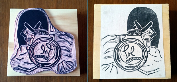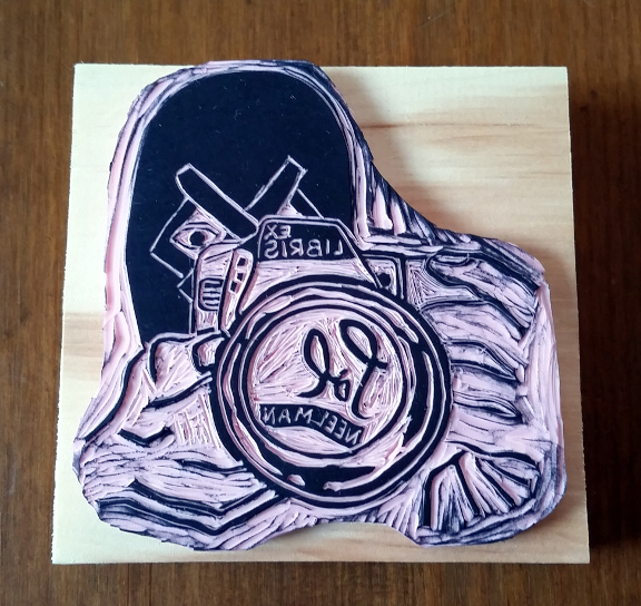 I used an illustration from a friend of his, clipart image of hands holding a camera, his actual signature, and downloaded fonts to make an image in Photoshop that I printed and transferred to the stamp medium (an easy-carve stuff). It’s mounted on a scrap of 1-by lumber.