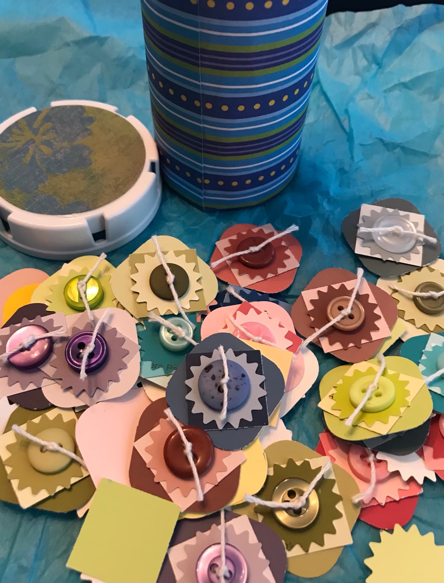 Lots of cute embellishments made from paint samples stored in a decorated pill bottle