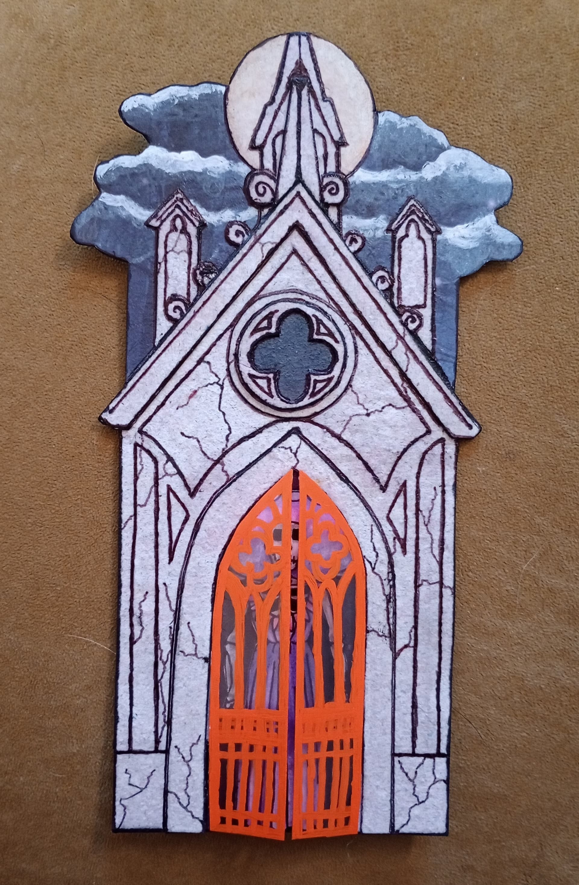 I was inspired by southern mausoleums and I saw one that had a red gate so I used some plastic sheets I saved from something and I used a red acrylic paint pen to make the gate design on both sides.