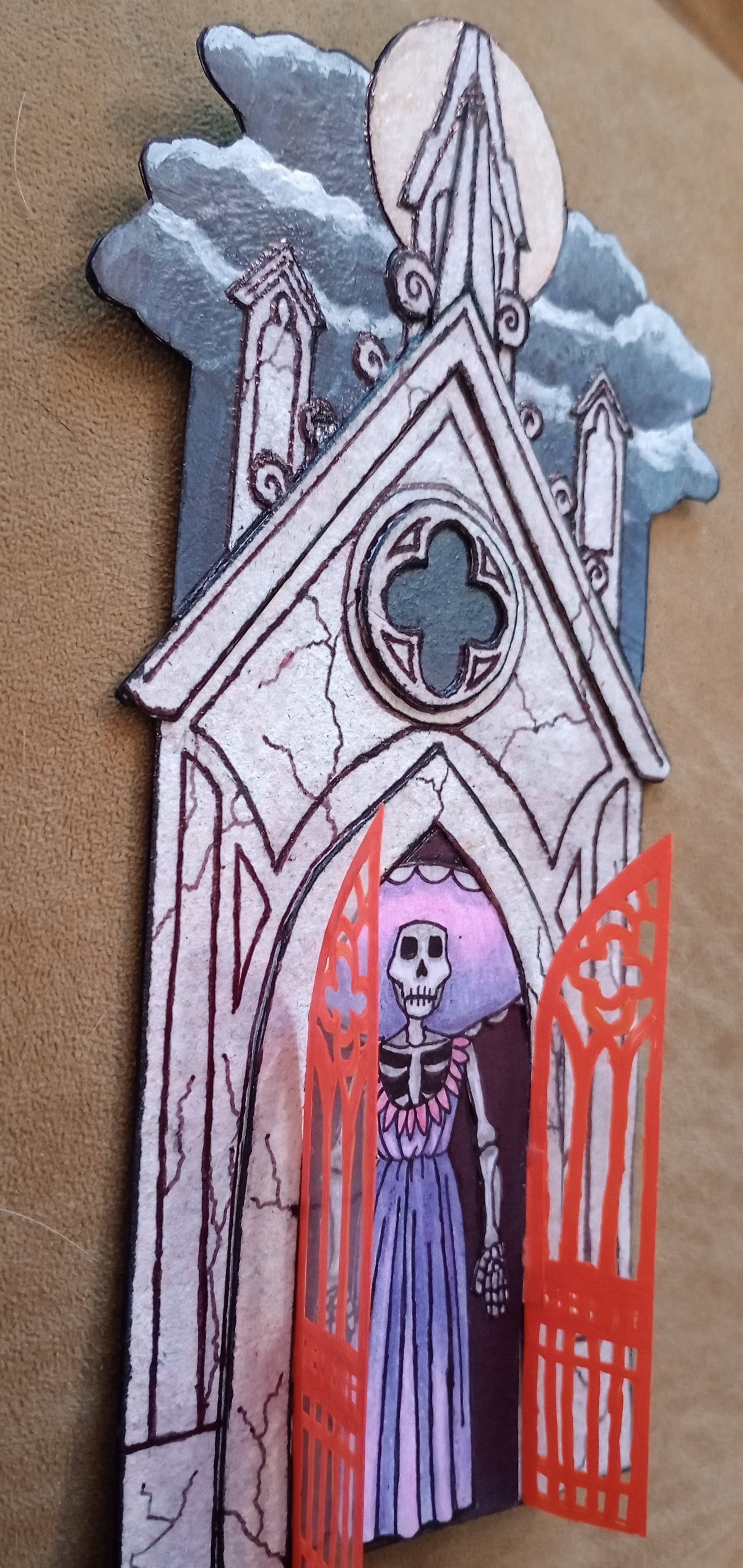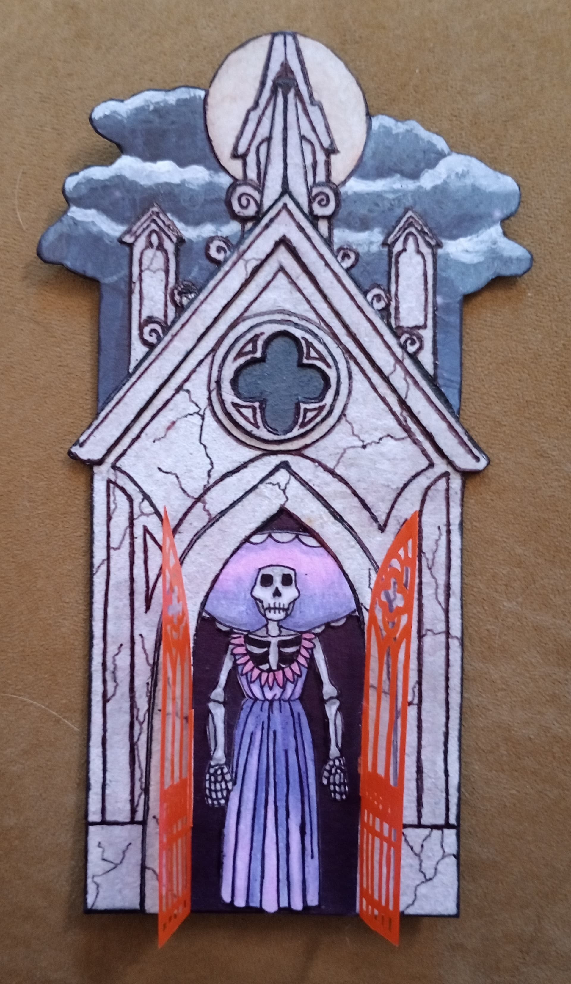 I tried to use some of Reese’s prompts but stuff kinda just went in one direction and I ran with it. She had red, purple and black as color preferences and that made me think of old Gothic stuff hence the mausoleum and she also had Day of the Dead so inside is a Dia De Los Muertos skeleton heading out to attend the celebrations. I’m guessing she’s gonna have to take her hat off to fit through the door? Lol don’t wear such a big hat next time, lady.