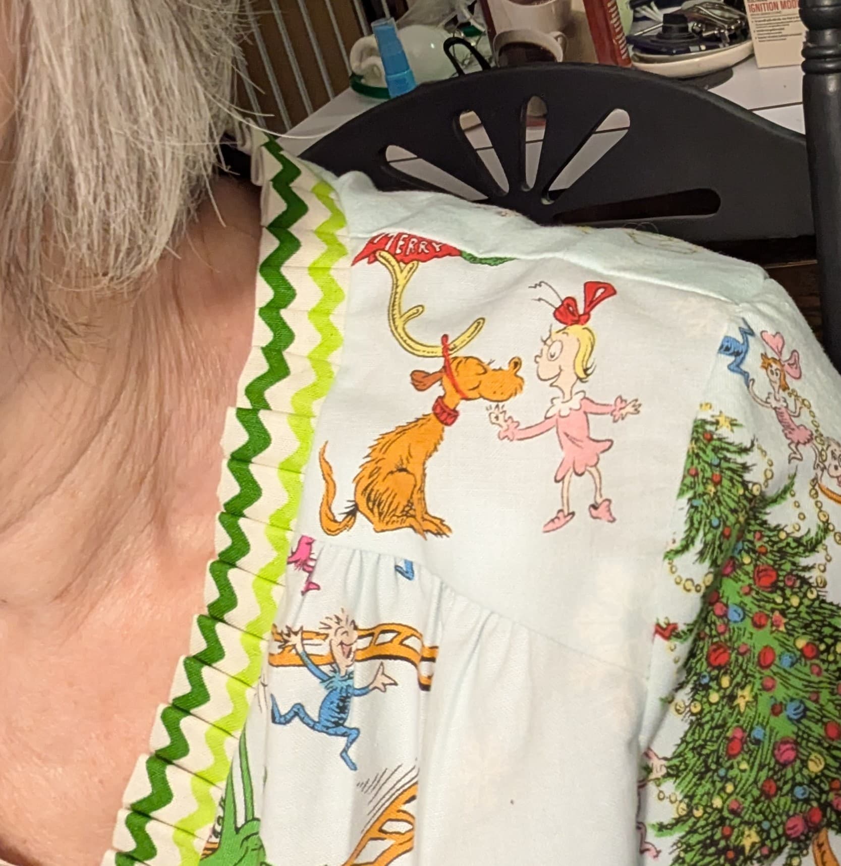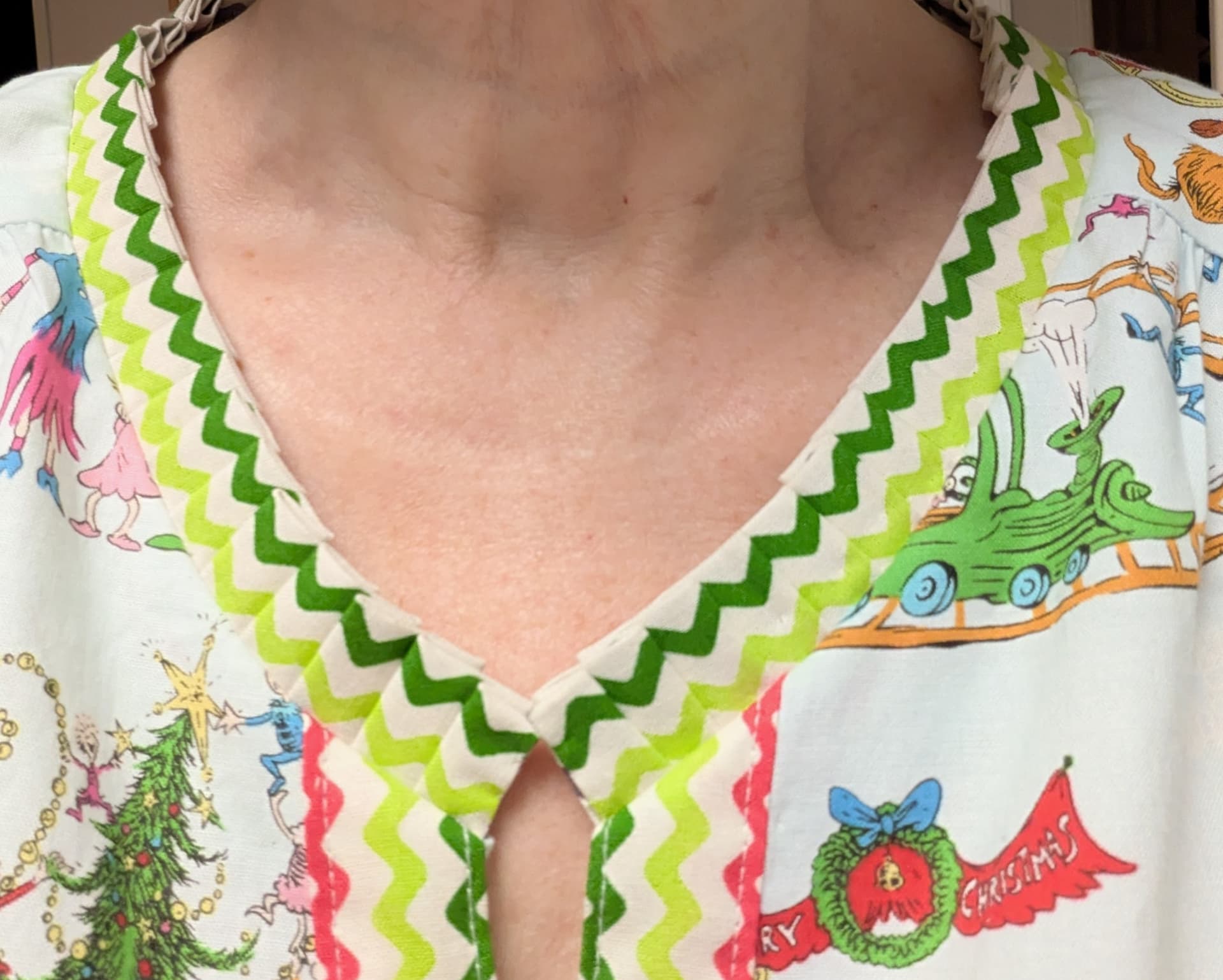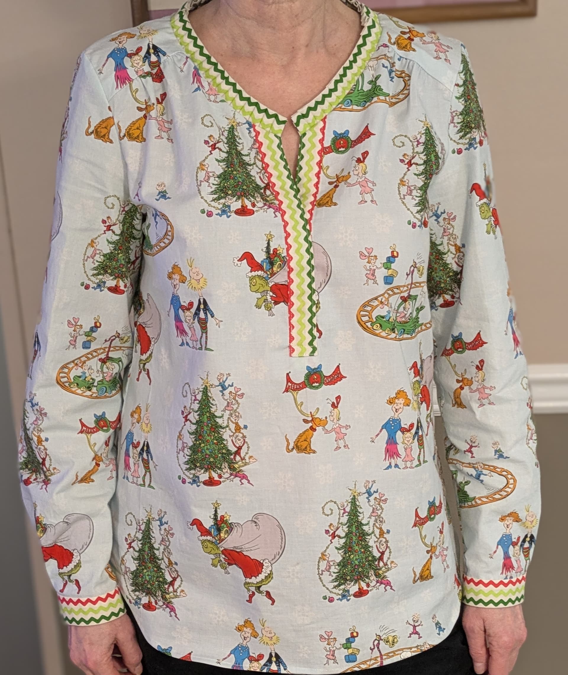 Your blouse is so fun and festive! Your sewing is, as always, impeccable. The rickrack fabric really complements the Grinch print.