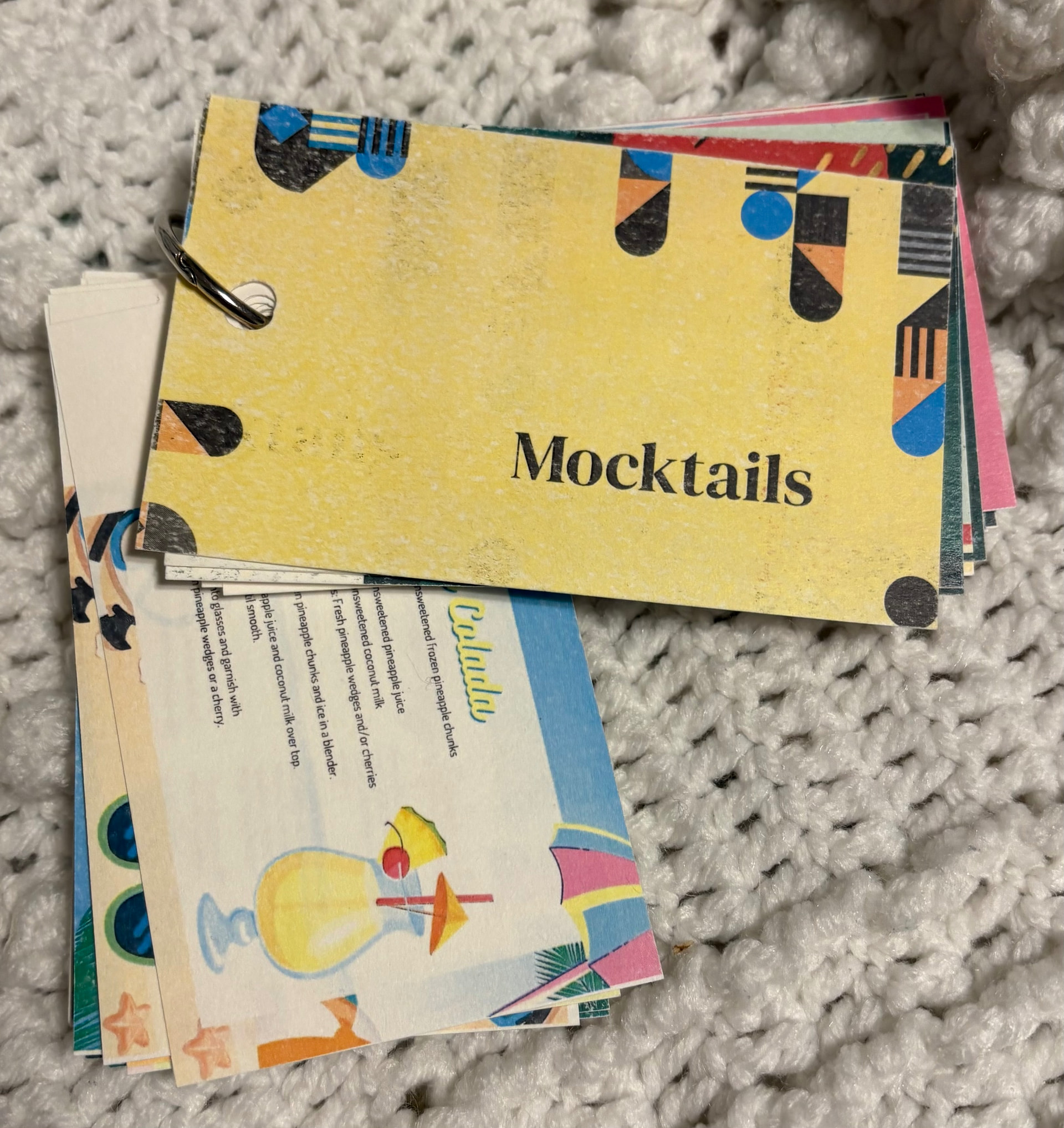 I have between 40 and 50 recipes, so far! The book is really only mini in size because I only had enough cardstock to print 4 to a page, instead of 2 like I originally planned. In hindsight, it turned out to be a good thing because many of the pages printed smudgy, and because I used white text on a pastel background for some, they’re hard to read. I also cut one wrong, so it’s in the book upside down, and punched a hole in the wrong place for another. At some point, I will go through the recipes and change the font color, and print them again, maybe at a print shop. I opted not to use my binding machine so I could add more in, or reorganize them. I do like that it’s small enough (about 2.5” X 4.25”) to easily take to the store, too.