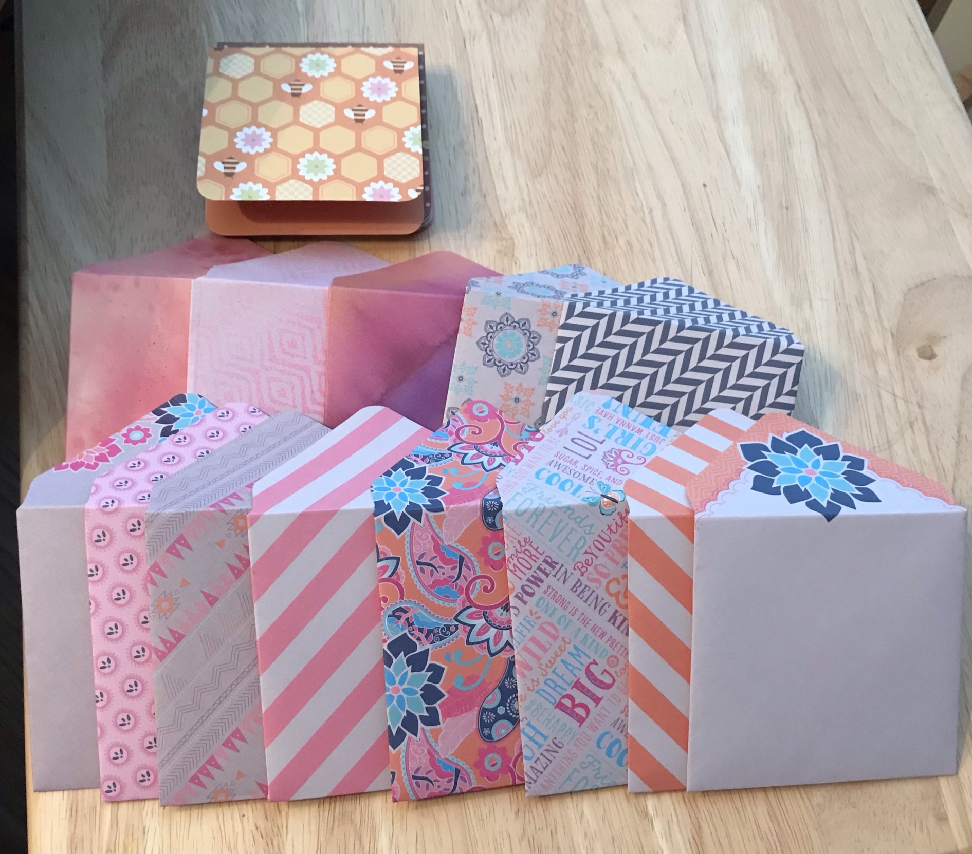 And I also made envelopes. I did trim about 3/4” off each ending up with 5 1/4” squares to make my envelopes but could have left them 6x6 and have them a little large.