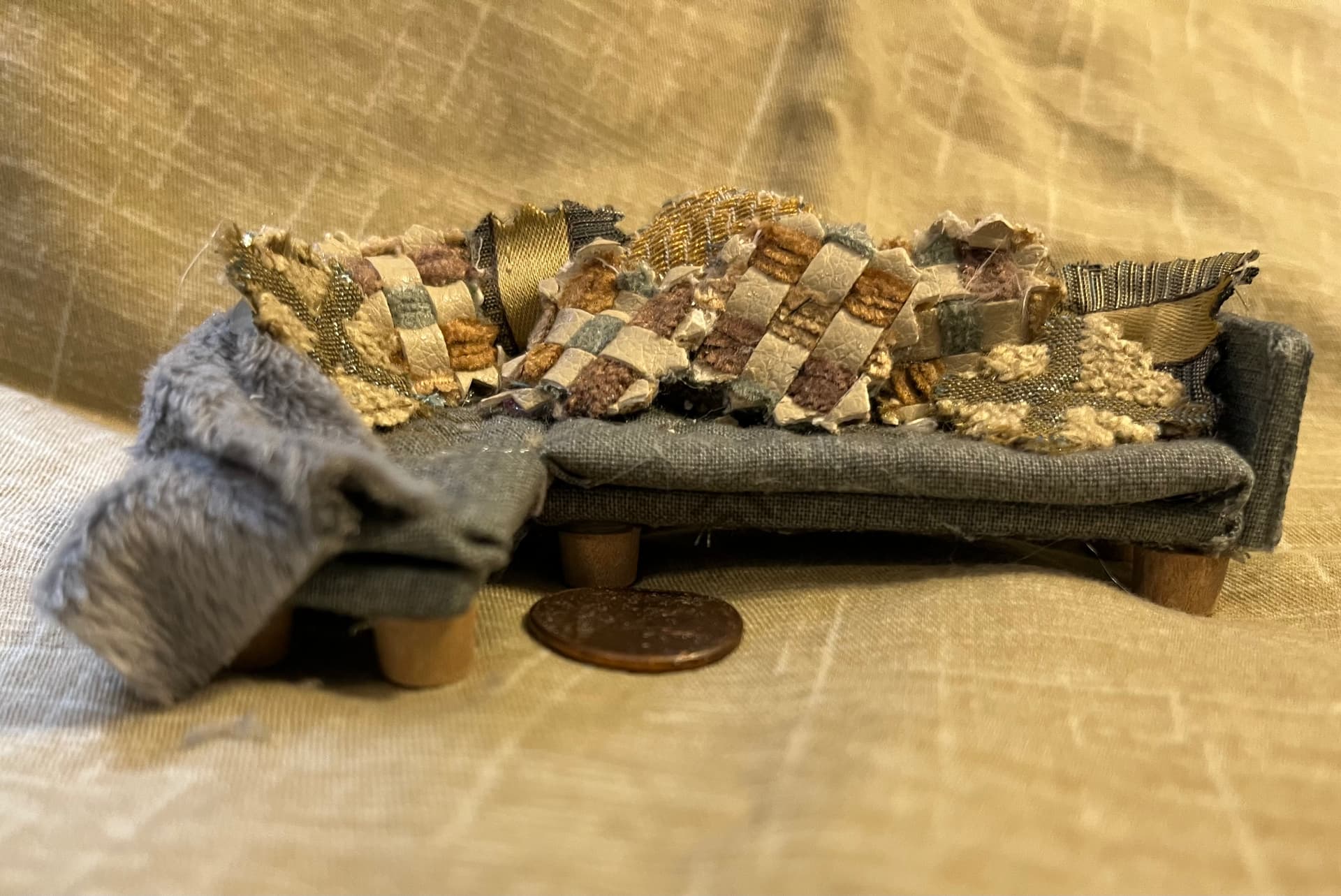 I had the pegs for the feet in stash. And a snippet of minky made a good throw. I glued it on with some folds to hopefully make it look like someone just moved it aside to get up for a snack or something.