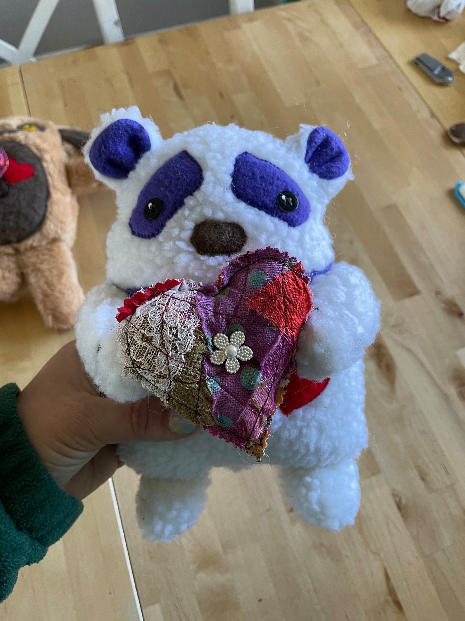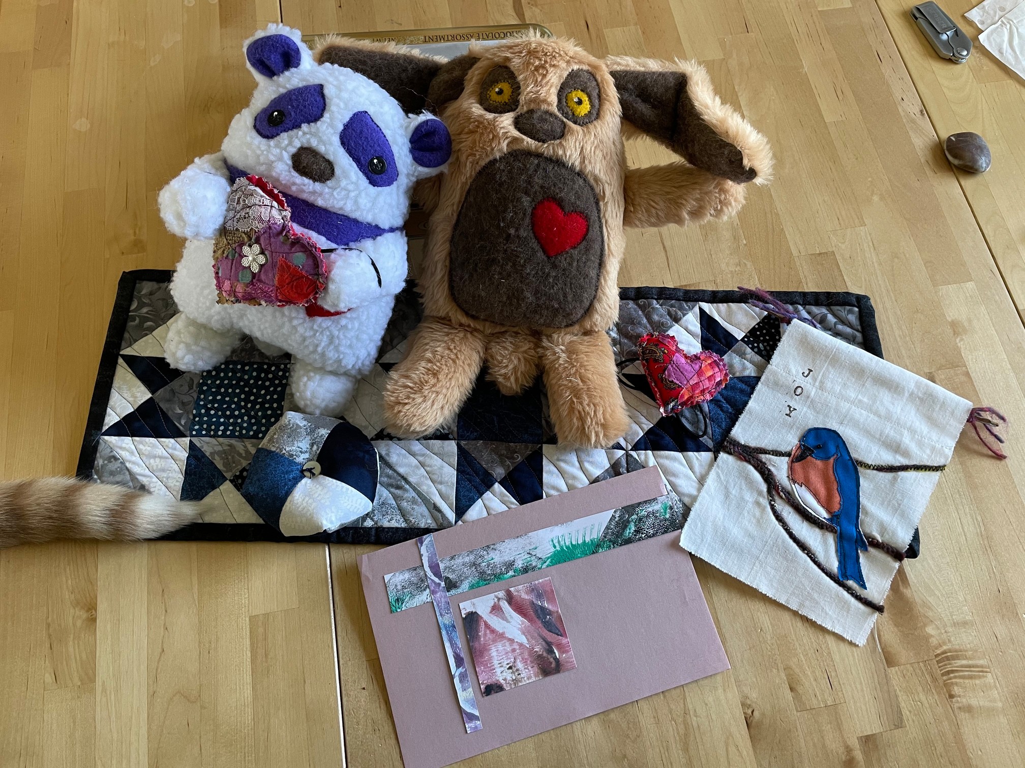 So much great stuff! The heart holding stuffies are super cute, that hummingbird painting is beeeeeautiful, I’m am over-the-top impressed by the quilting and stitching projects, and the wool fairy makes me want to reach through the screen to touch. What amazing packages