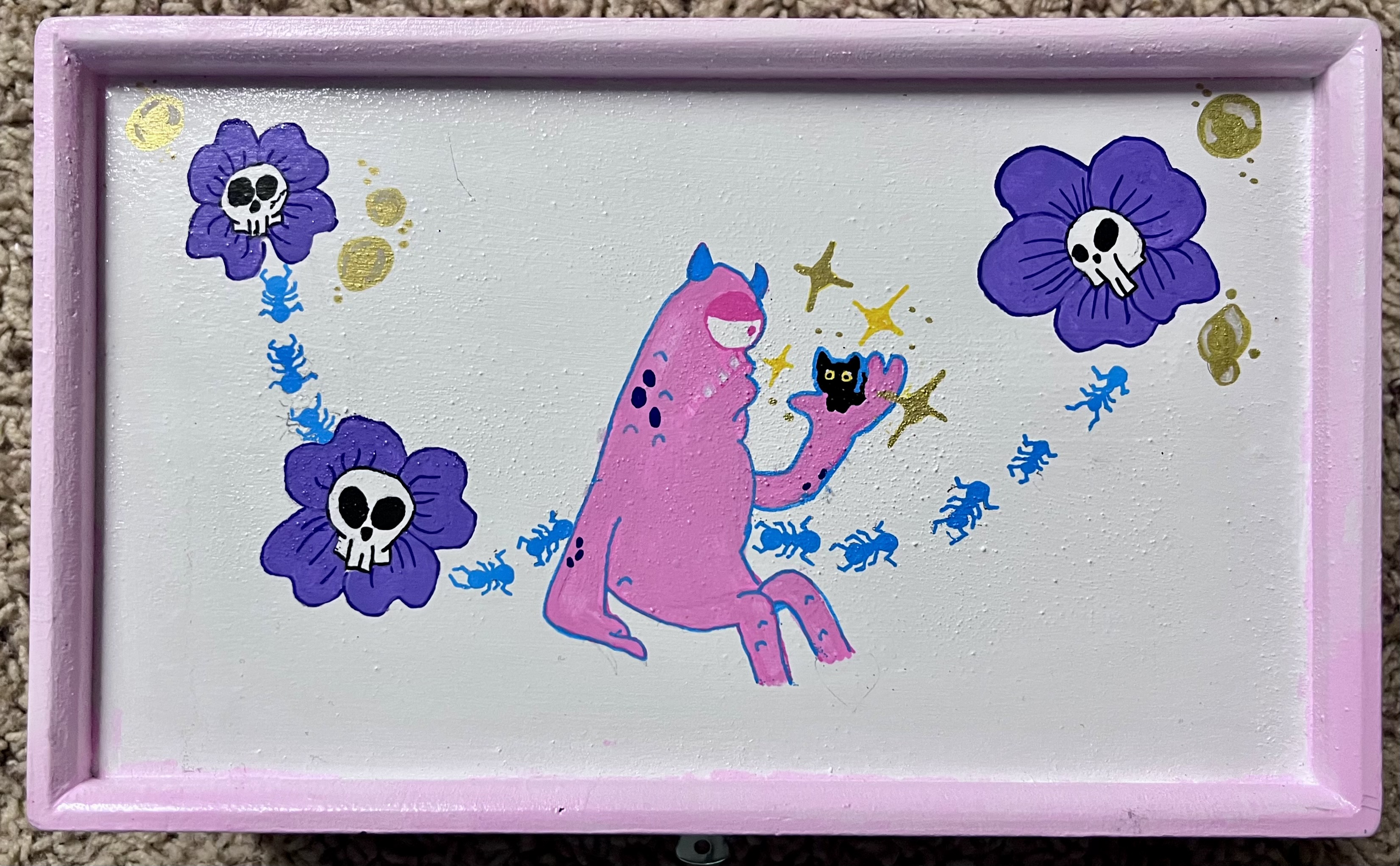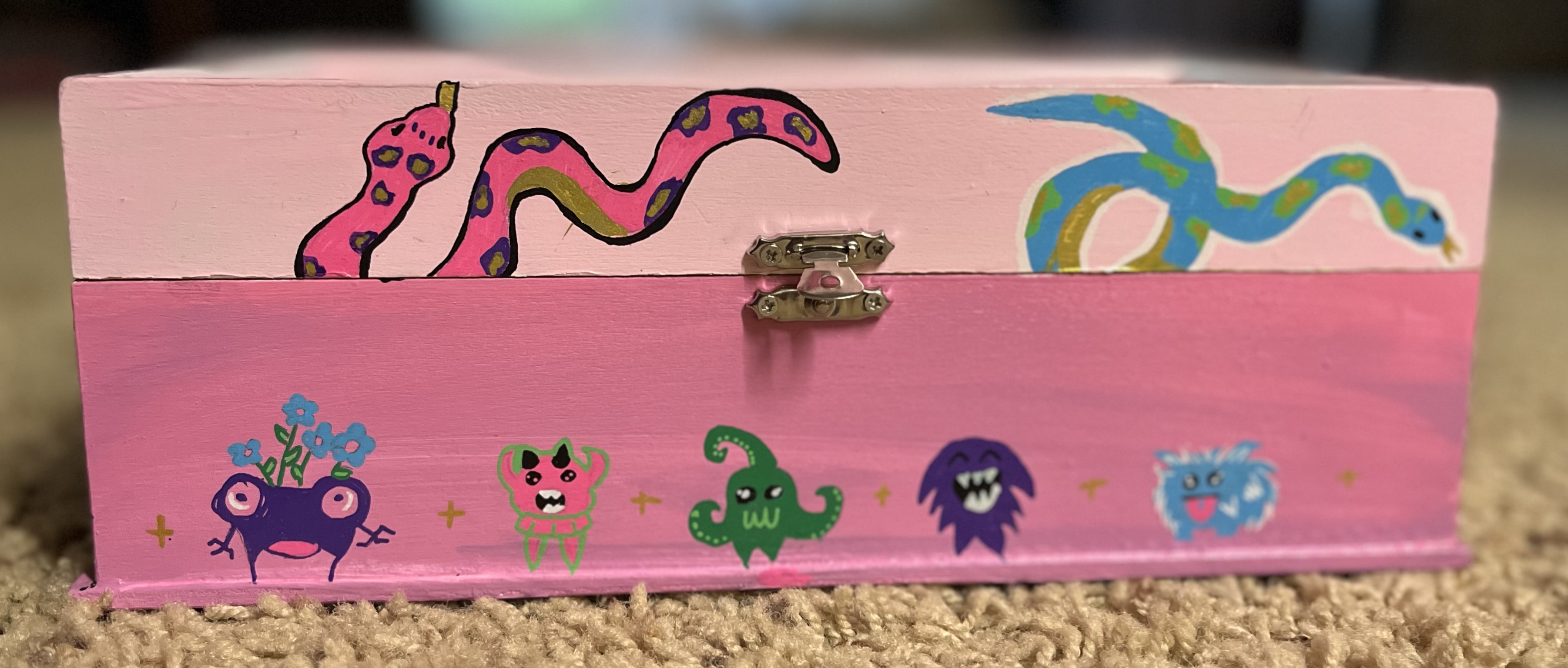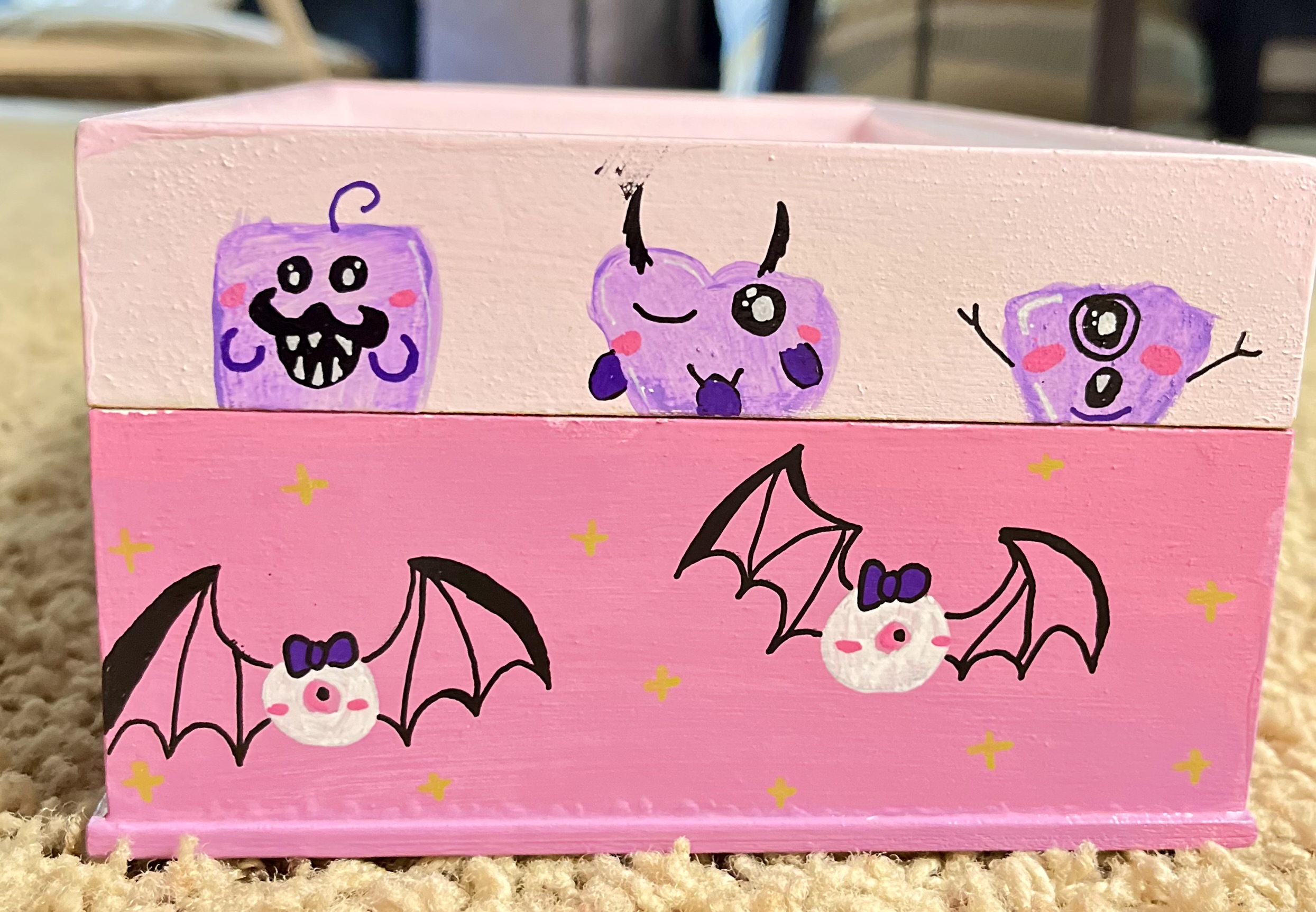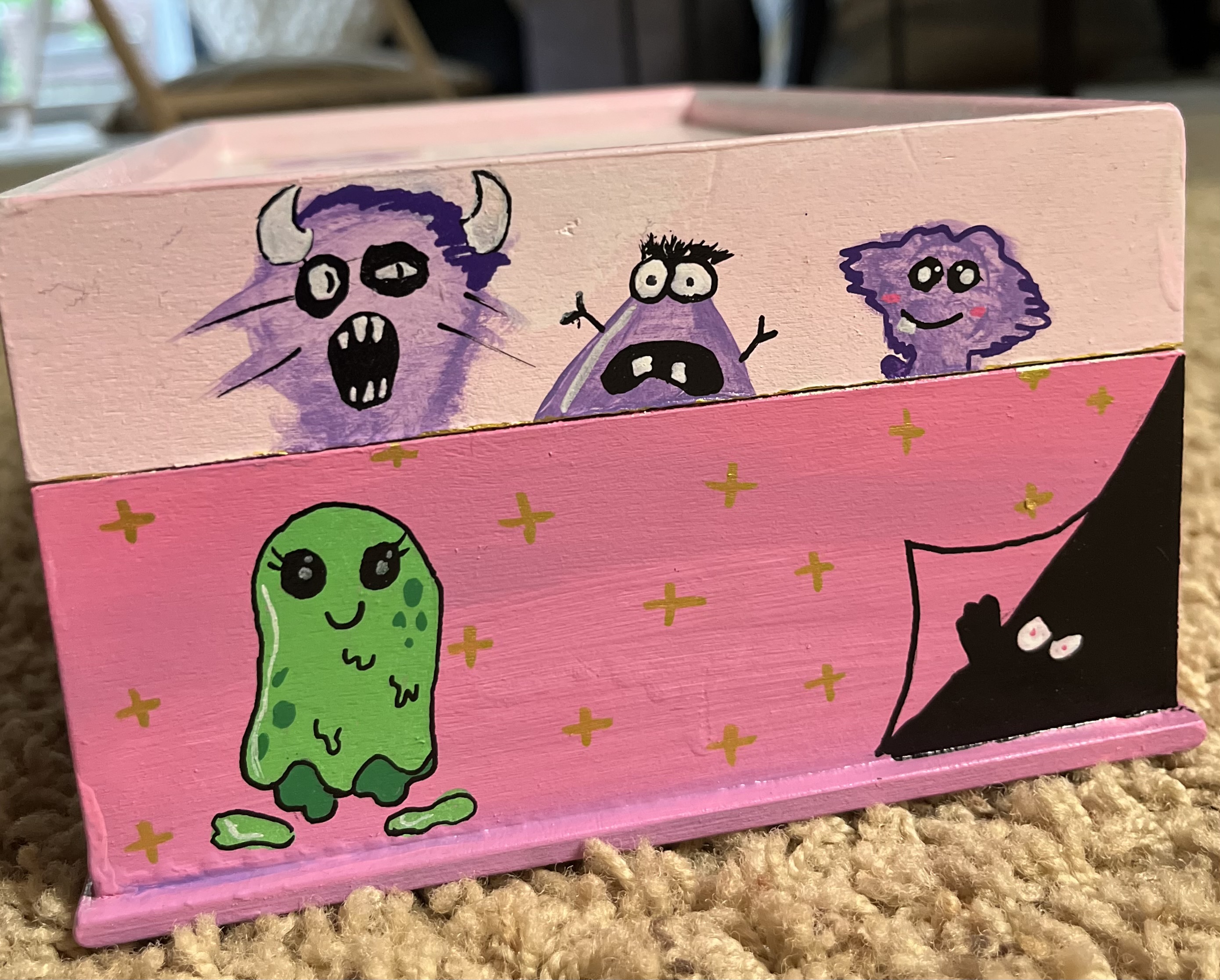 Your monster looks friendlier. I love a unique practical item. How fun it is to have jewelry or trinkets in a box decorated with cute monsters (and handpainted!).