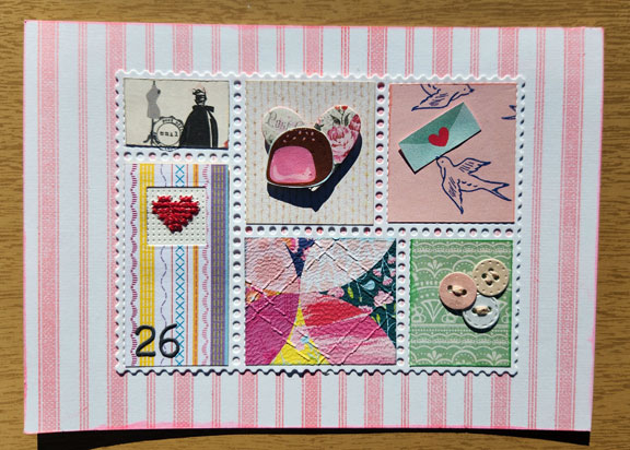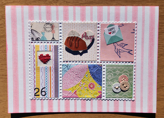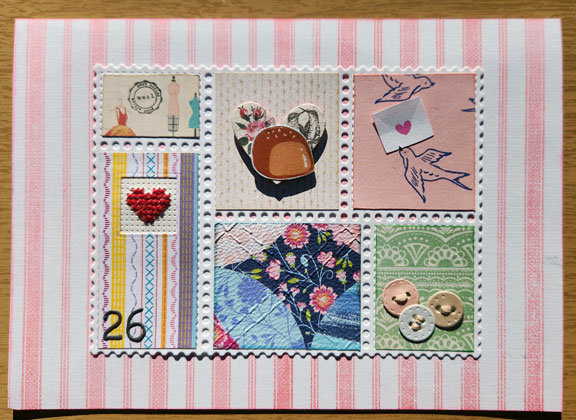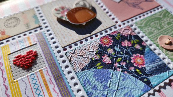 The chocolates are fussy cut and coated in Glossy Accents glaze, the little birdie’s beak is cut so the fussy cut envelopes can be “in” them, the paper buttons have thread, the quilt-y print is embossed with a “quilted” folder, and the heart is cross stitched on paper.