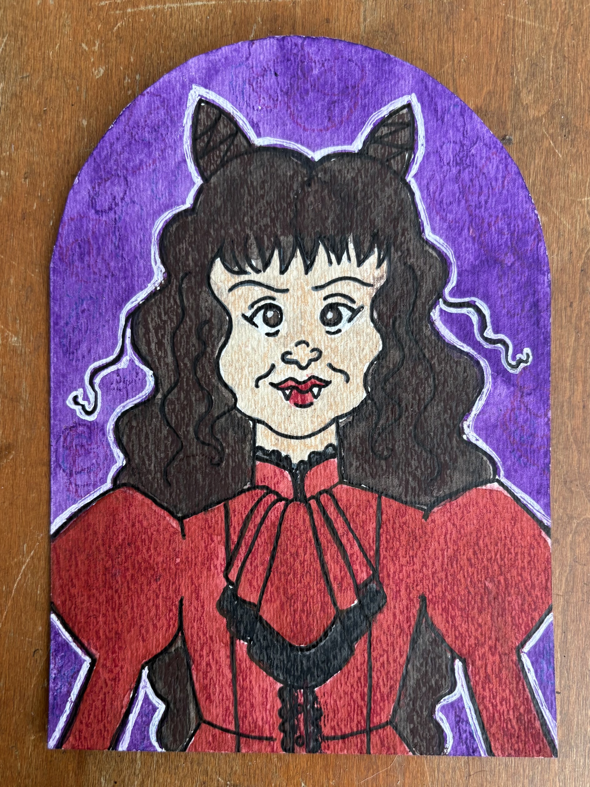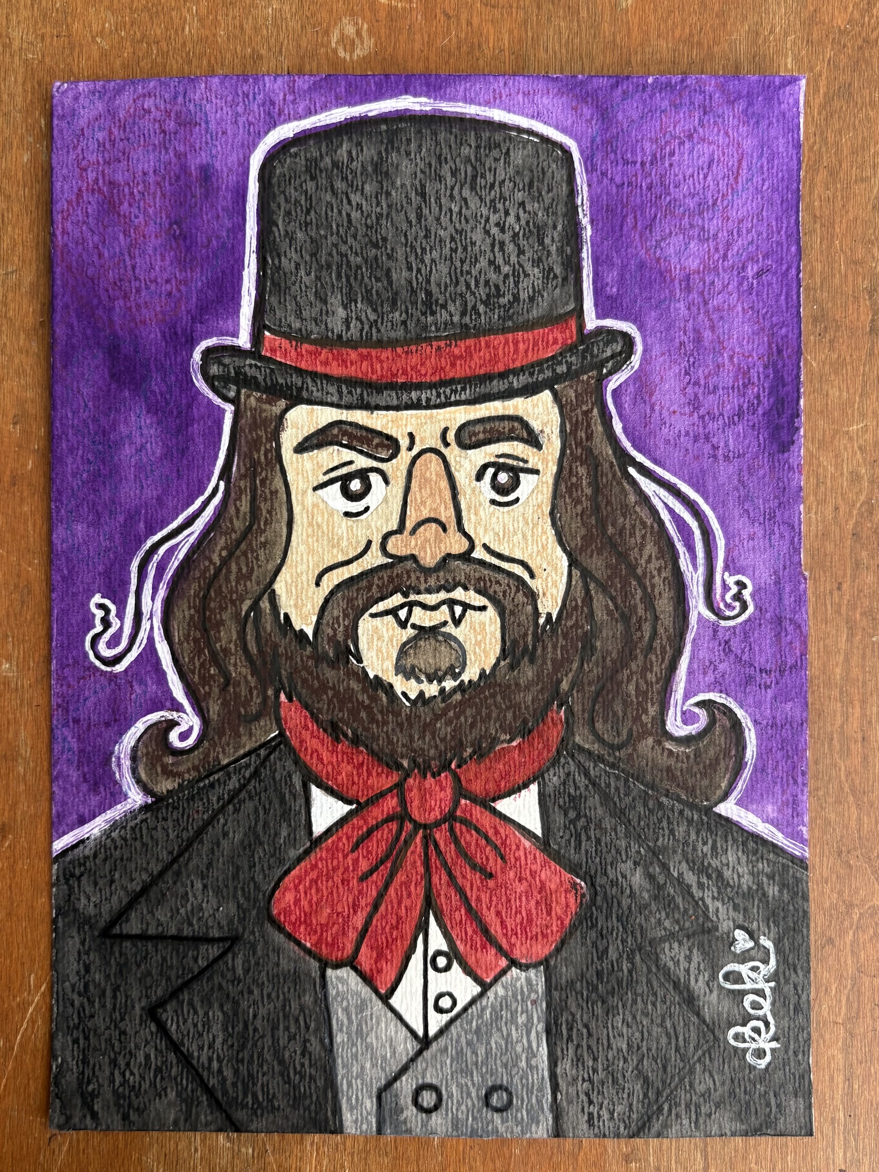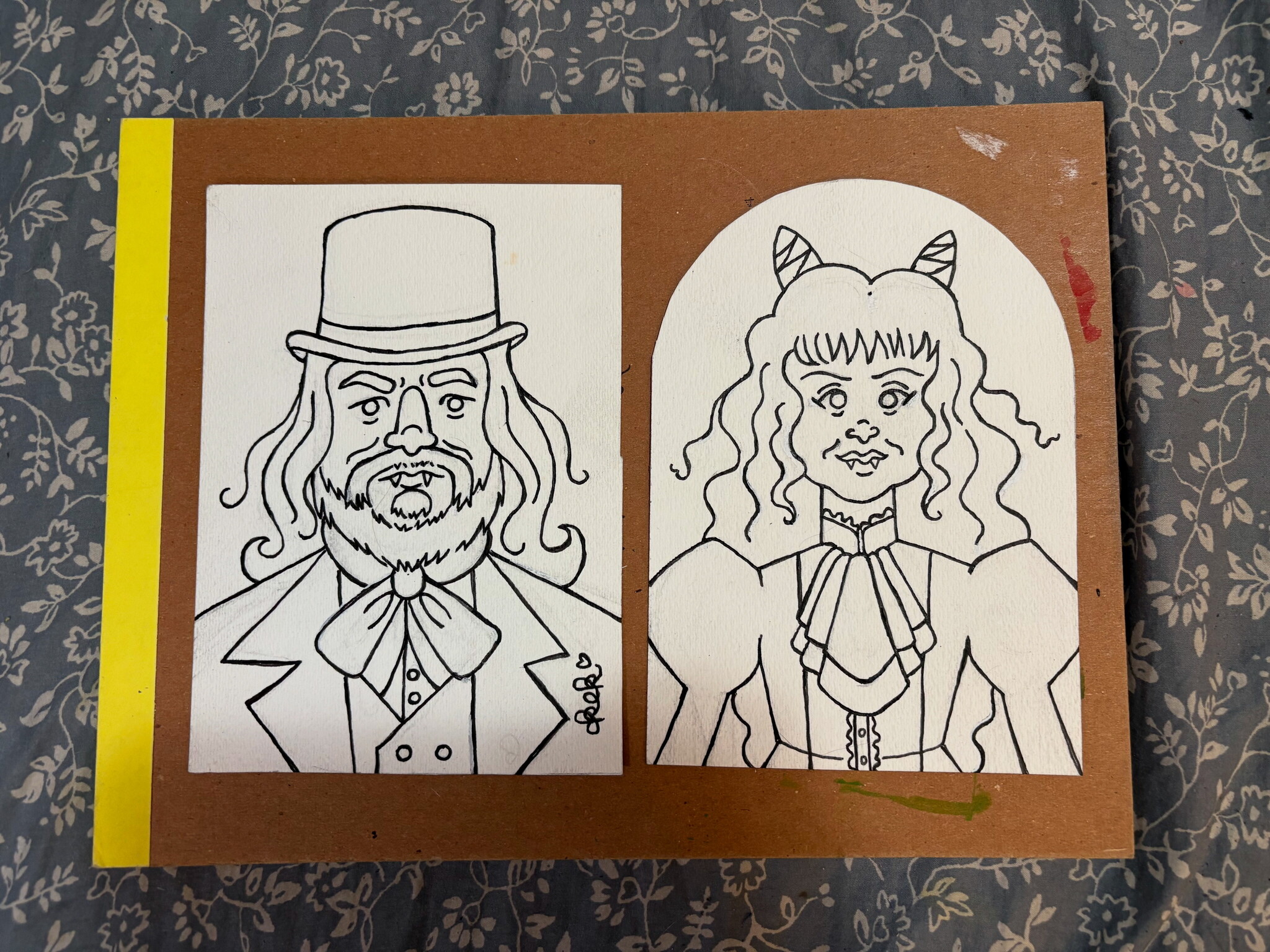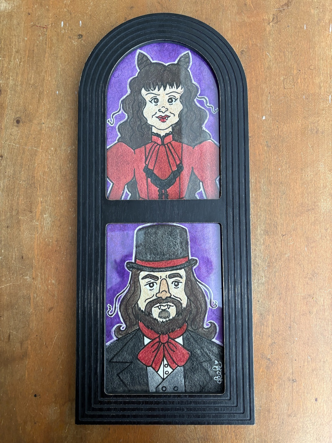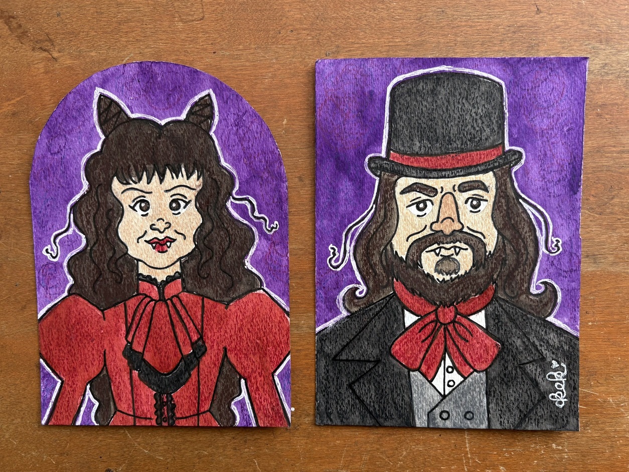 Anyhoo, I decided to make Nadja and Lazlo from the show. I am sooo happy with how they turned out. Watercolor and Crayon per usual…