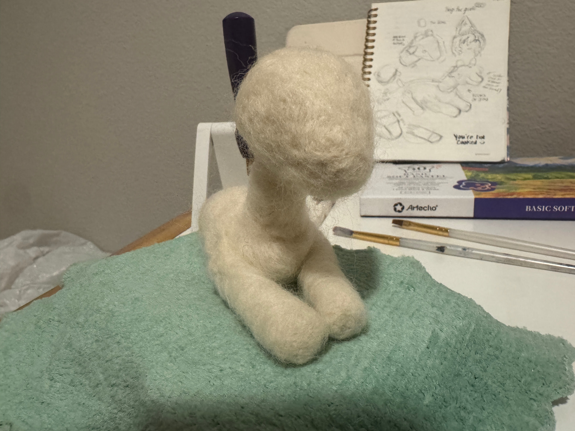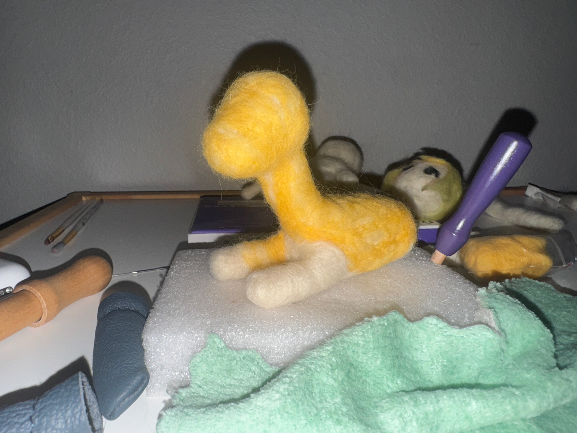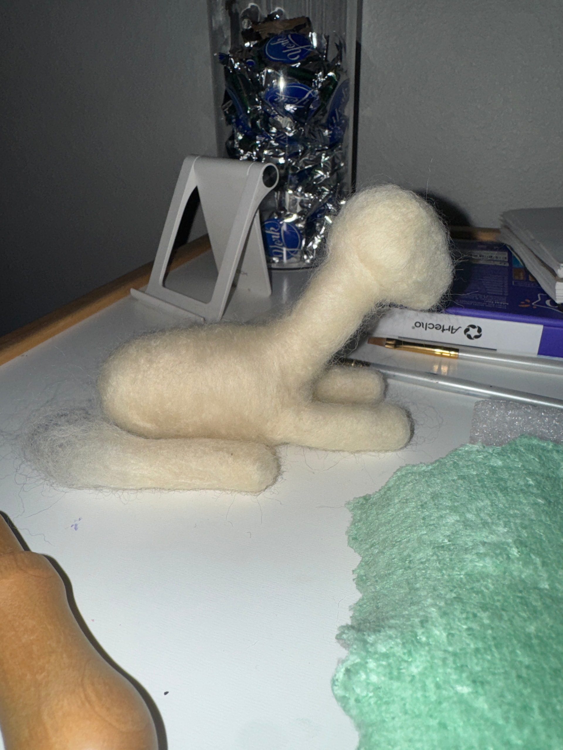 I made a few mistakes in the process, mostly not using enough/too much wool for specific portions of the body but I think I made it work Some parts are firmer than others (too much wool) but over all its pretty squishy! His name is cheese stick because he has a few bald spots where you can see the core wool underneath the color. I did my best with 3 grams of roving