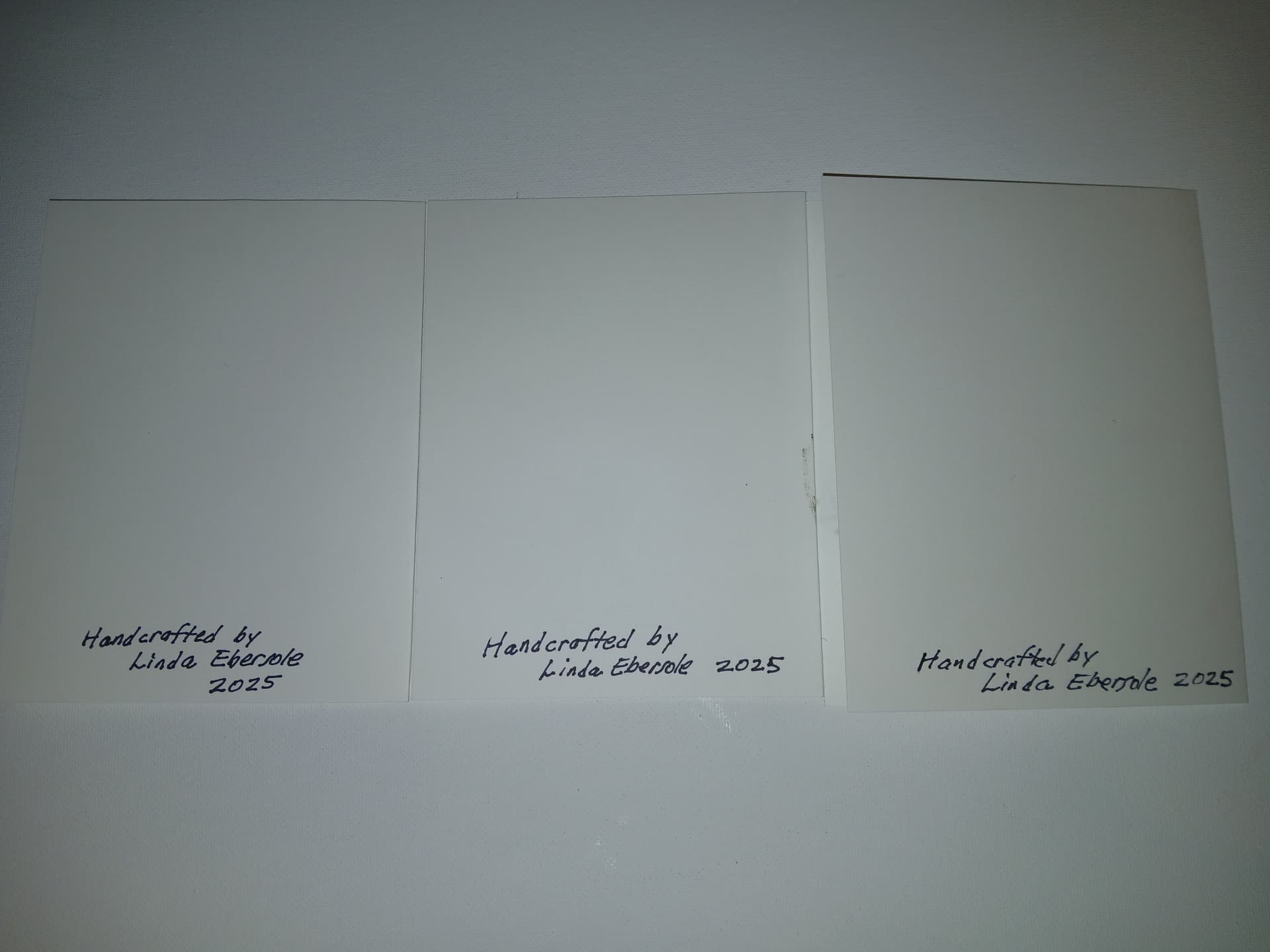 I made six holiday cards for the Christmas CardSwap4. Since no one has yet received , and I know most of them won’t be able to resist peeking, I am only going to post the backs until everyone receives! I used white card stock to fit the prompt. ![]()