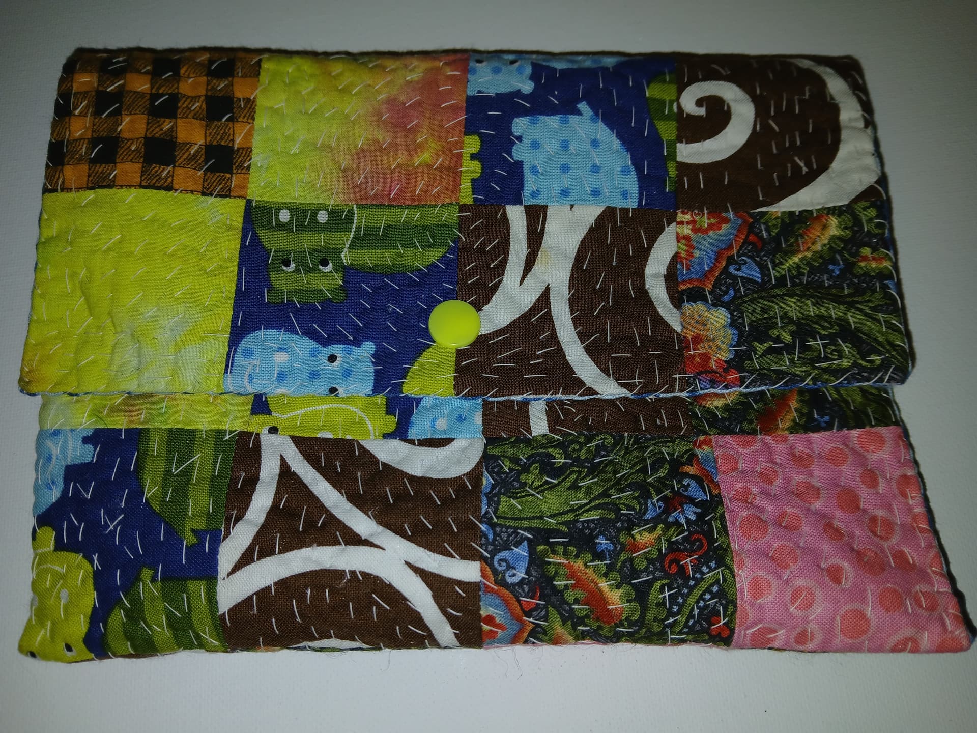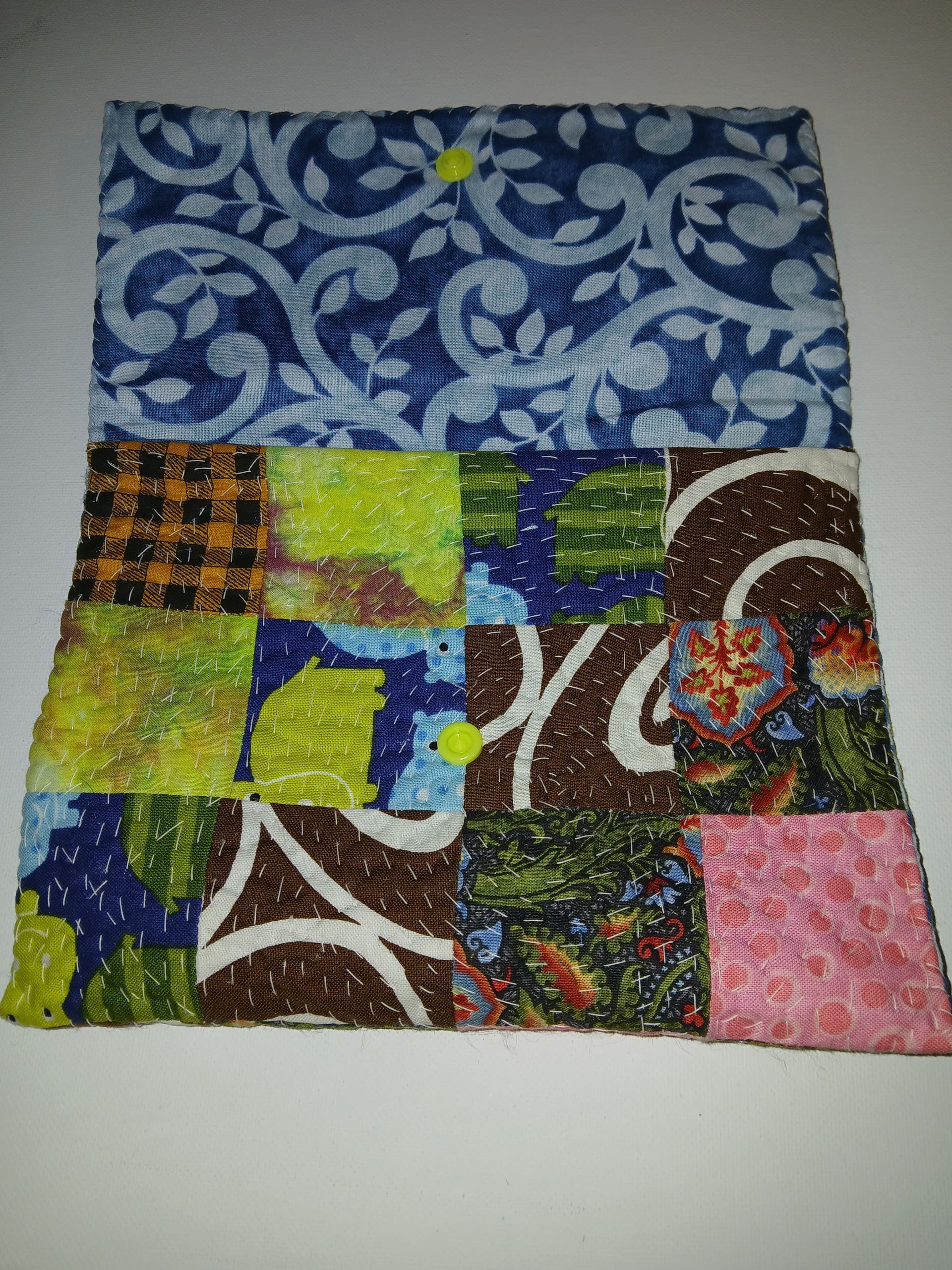 Brief Description: I am making things out of orphan quilt blocks and scrap fabrics. This one has brown squares. To tie all the fabrics together, I used kantha style stitch all over. The lining is a leftover piece of batik from my stash. I think blue and browns go together nicely.