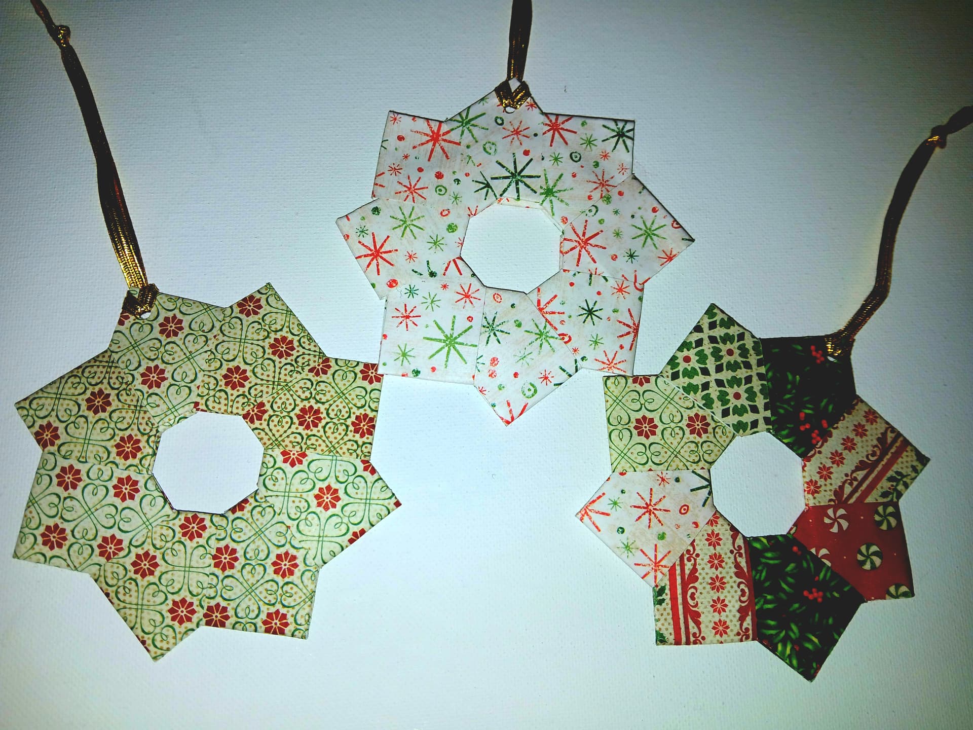 Brief Description: I used up some stash Christmas paper to make 18 paper wreath ornaments. They were fast and fun to put together. They are multi-colored.