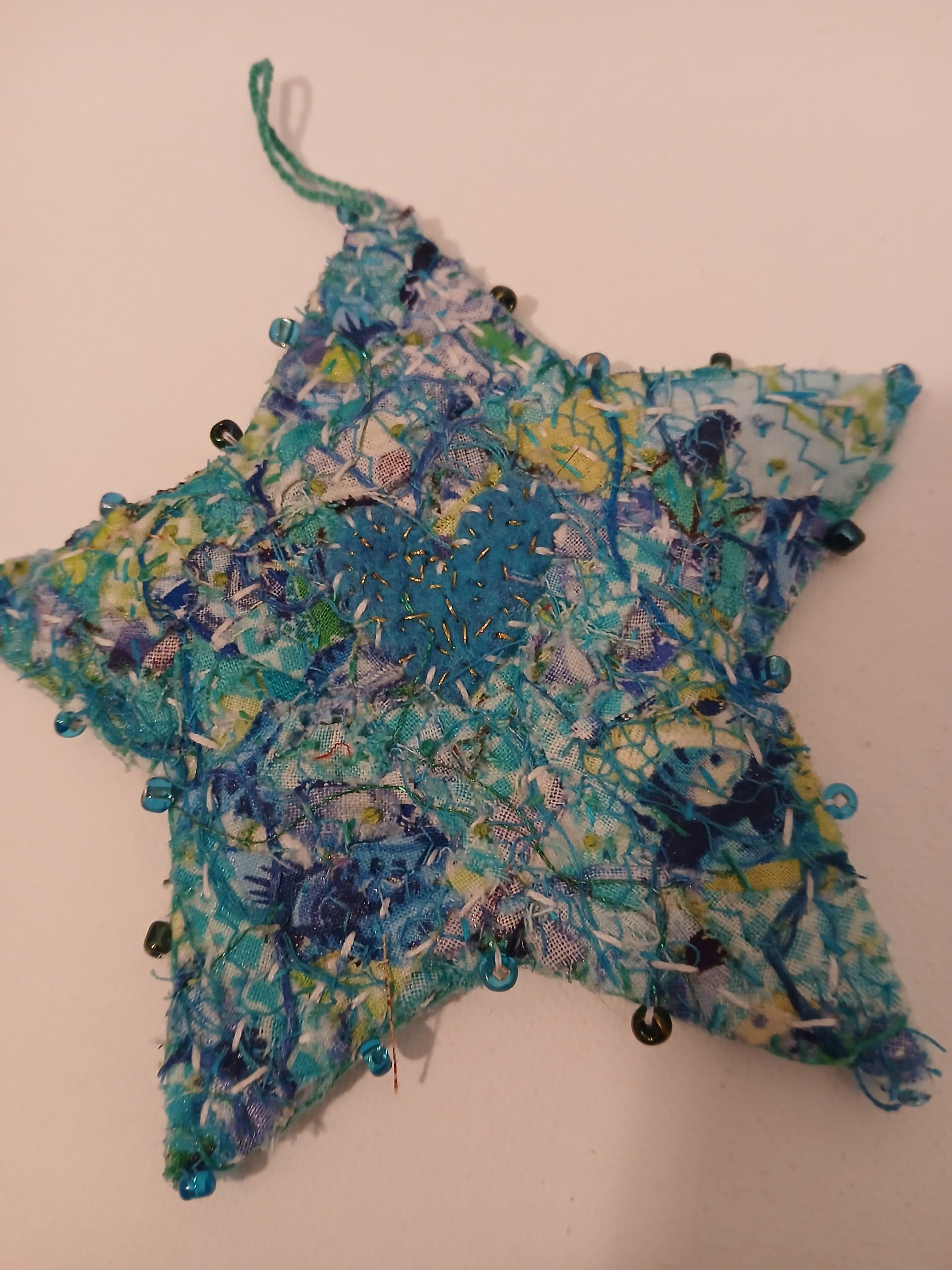 Heart ornament made from “fabric” that I made using tiny scraps and threads from other projects. (recycled, repurposed)