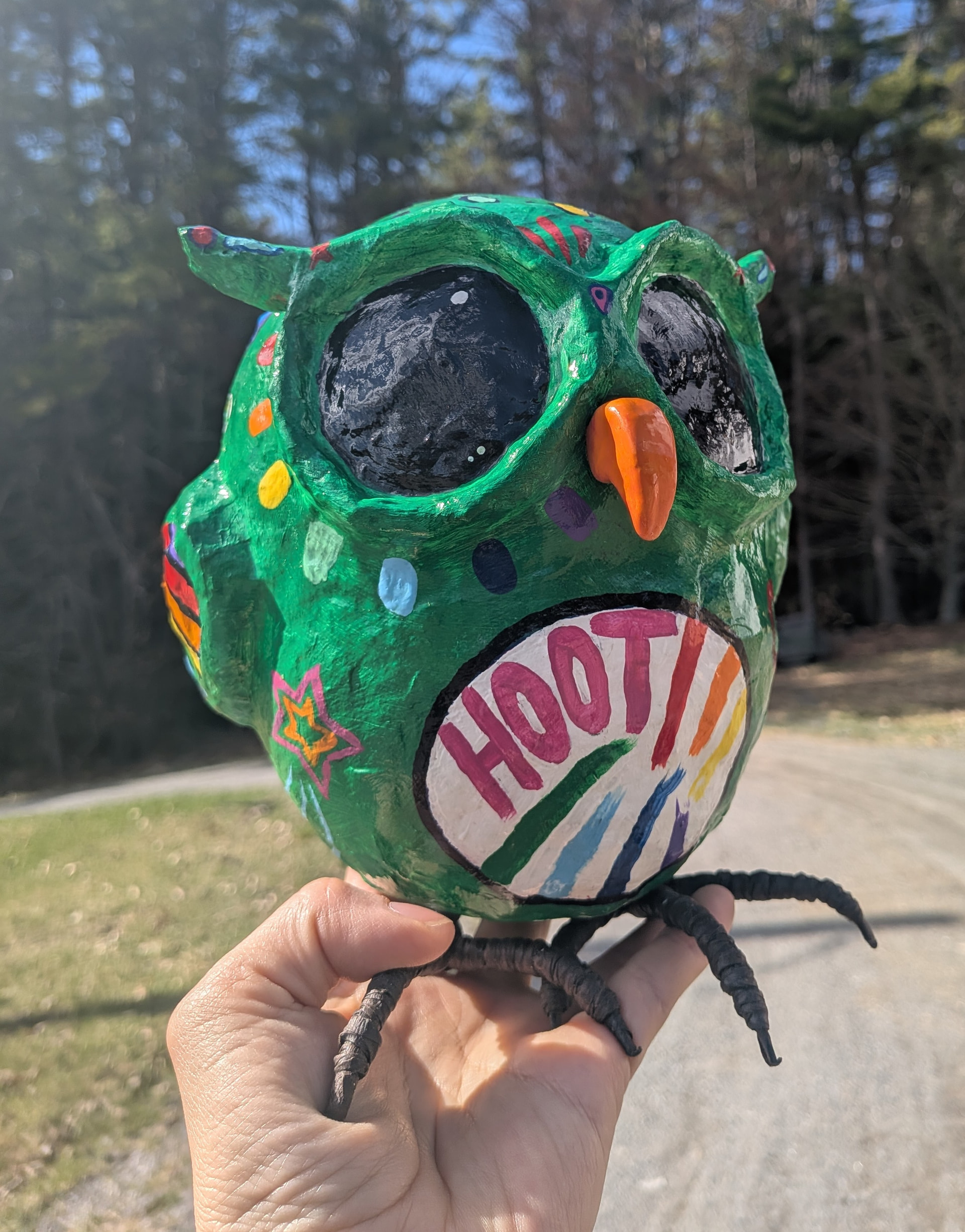 Prompt: April - Monster Mash Team: Team Totally Radical Project Name: Rainbow Fever Dream Owl Project Link:Rainbow Fever Dream Owl (paper mache sculpture) Brief Description: The base of my rainbow fever dream owl is green. The rest is decorated in pure 90s rainbow maximalist aesthetic. Think trapper keepers and jelly bracelets. Project Photo(s):