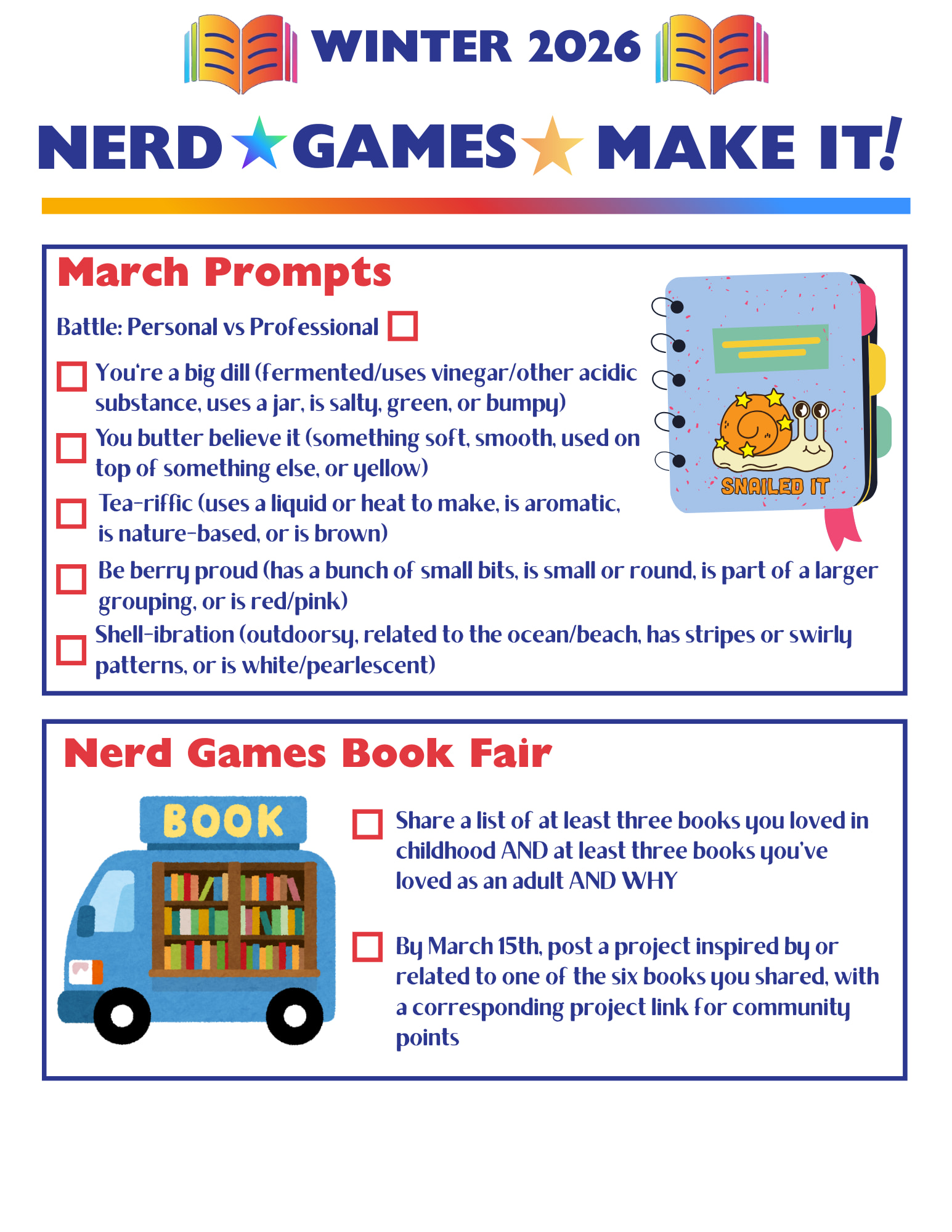 4th and last tracking page for the winter Nerd Games. The theme for March’s prompts is planning and goals so I picked a cute little planner as the graphic and then added a punny focal.