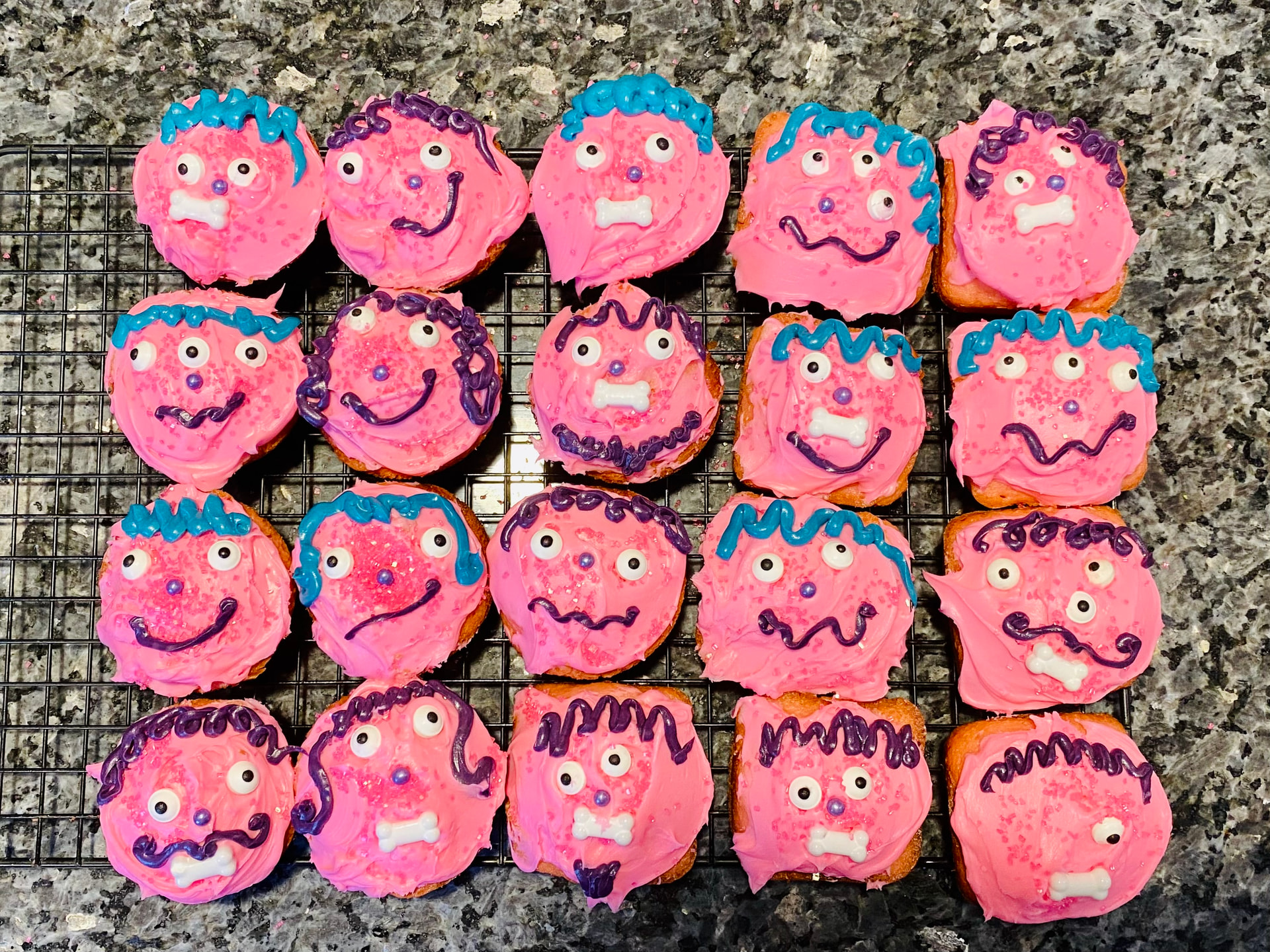 Brief Description: We’re having a sad few days in our house, so I decided to try cheering us all up, by baking cupcakes. I had lots of (mostly pink) frosting left over from making the gingerbread house. I was just going to decorate them with pink sparkle sugar, but Ada decided we needed to add eyes, and then I found the bone shaped candies that weren’t used on the gingerbread house, so she used them as mouths. At that point we just started “yes, and-ing” each other, adding purple sprinkles as noses, crazy hair, and some beards & mustaches.