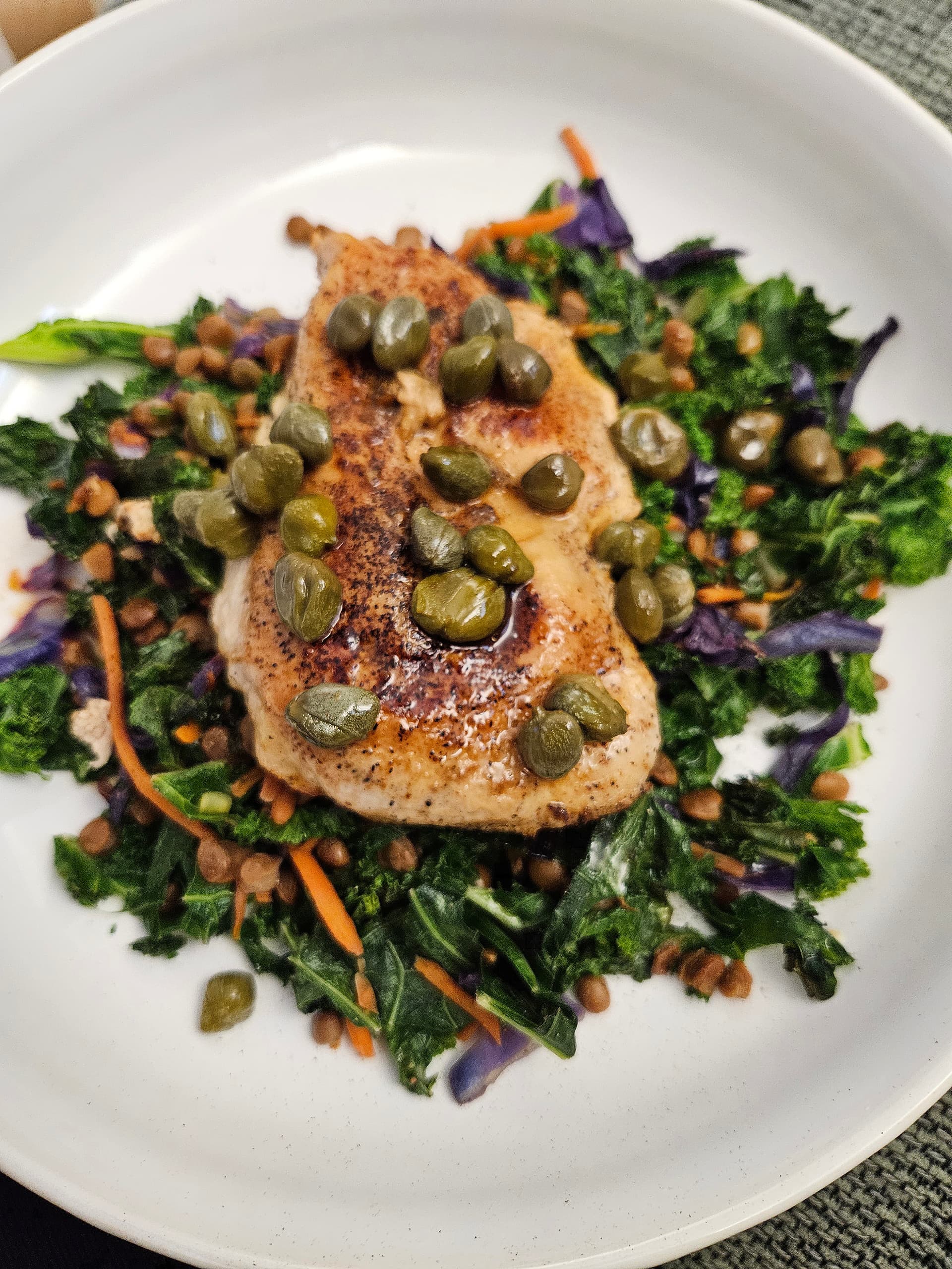 Brief Description: My version of chicken piccata, safe for our (weird) allergy & dietary needs with lots of green from the capers & kale