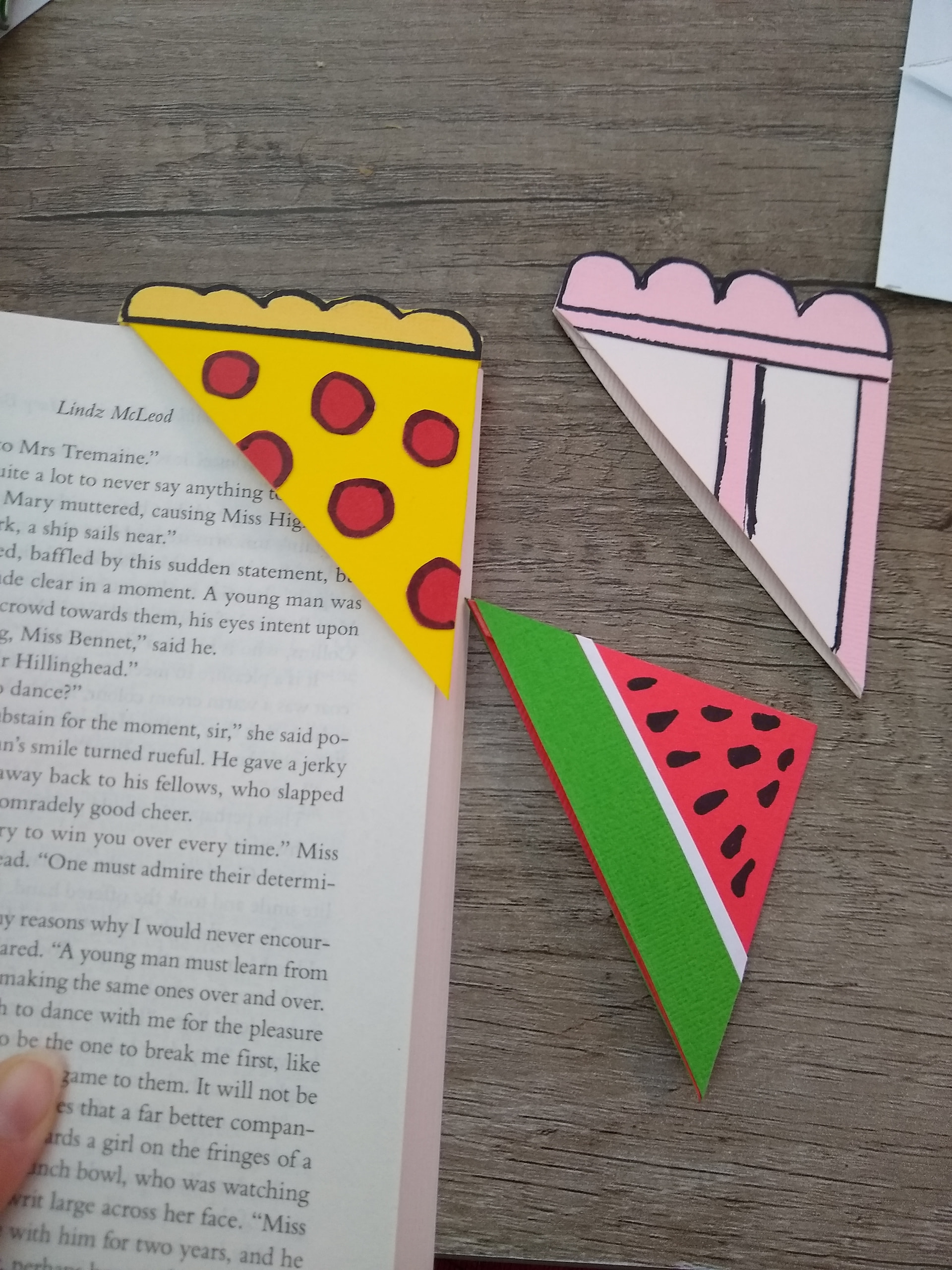 Brief Description: These bookmarks are part of a gift for a friend, are triangular and multicolored! (Also two are lliterally pizza and cake!)