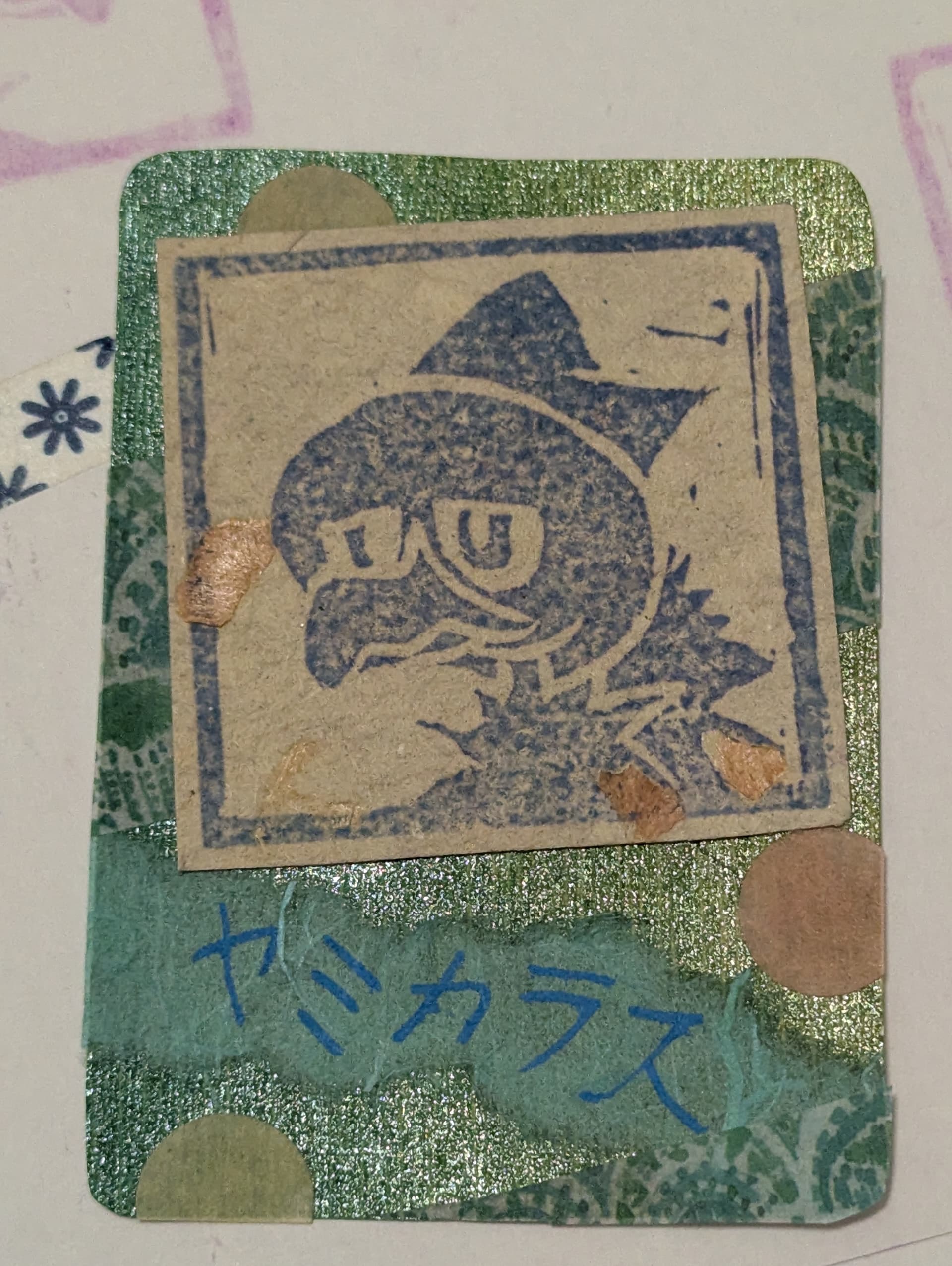 Brief Description: I used glue to make this ATC (and I carved a stamp and used washi tape to collage).