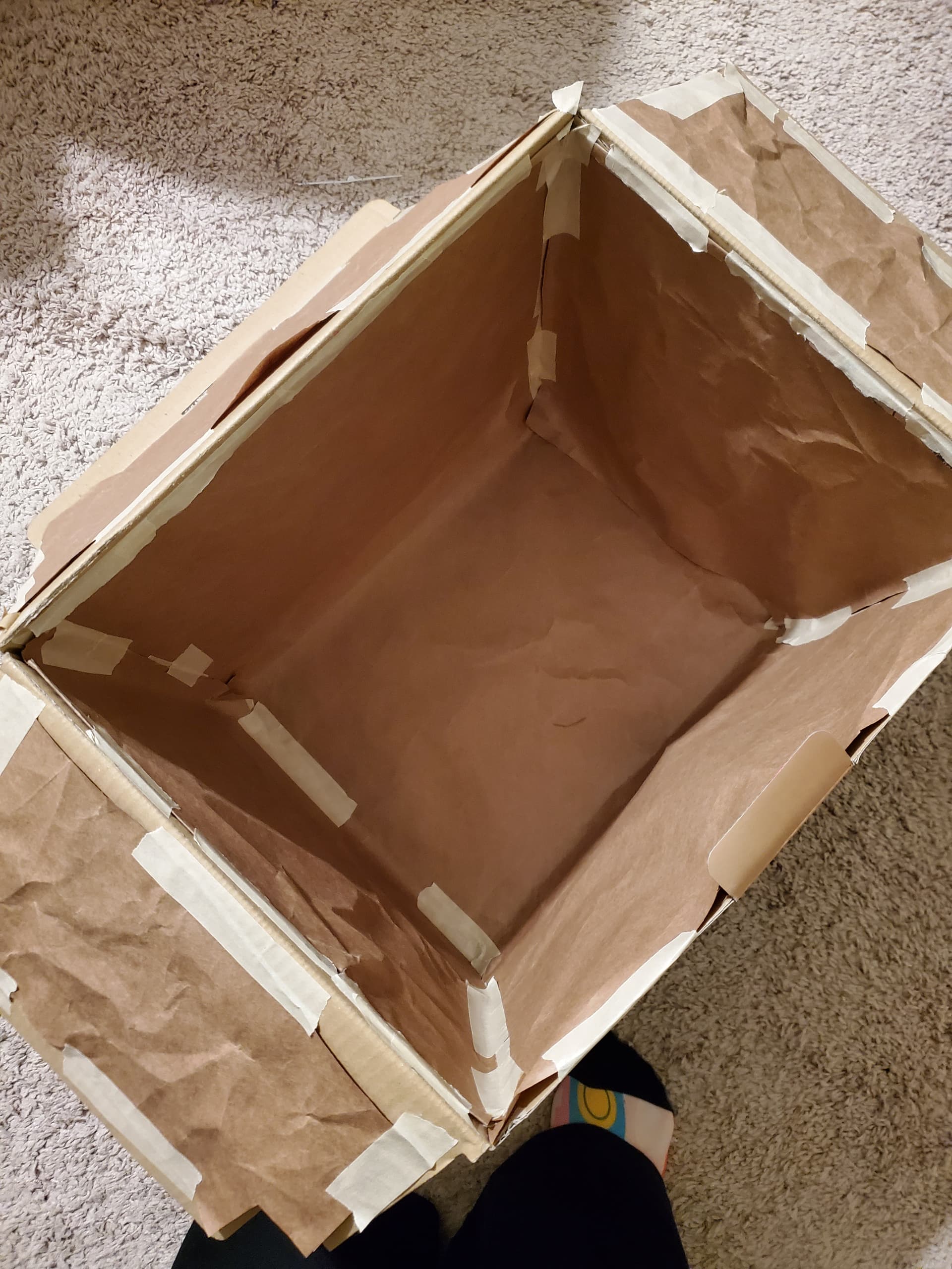 Prompt: Free Range 1 Team: Pepperoni Posse Project Name: Relining the splatter box Project Link: N/A Brief Description: I decided it was time to replace the lining in my paint splatter box. Originally it had a variety of magazine, phone book, map, etc. pages, but this time I simplified (ha!) by using a roll of kraft paper. Project Photo(s):